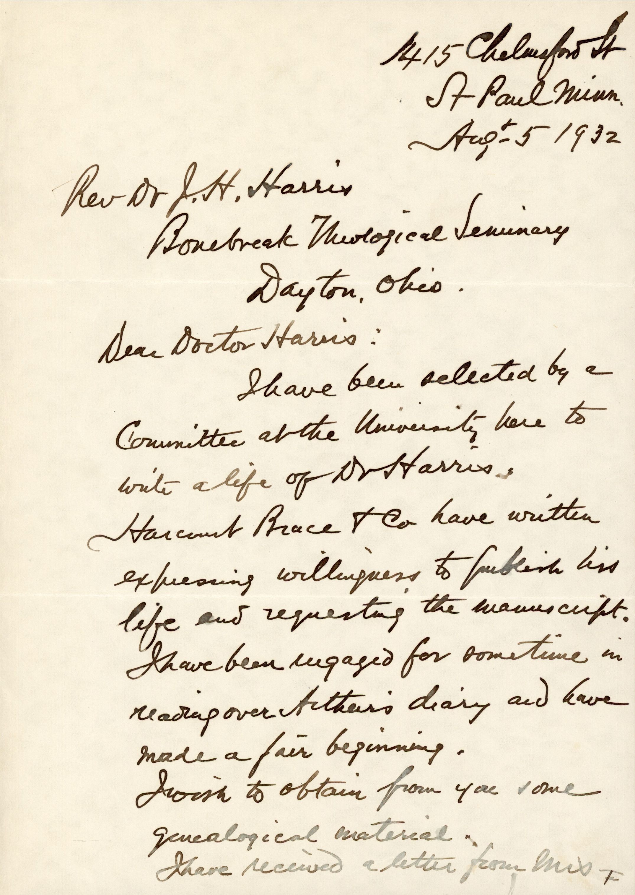 I have been selected by a Committee at the University here to write a life of Dr. Harris. Harcourt Brace & Co have written expressing willingness to publish his life and requesting the manuscript. I have been engaged for sometime in reading over Arthur's diary and have made a fair beginning.