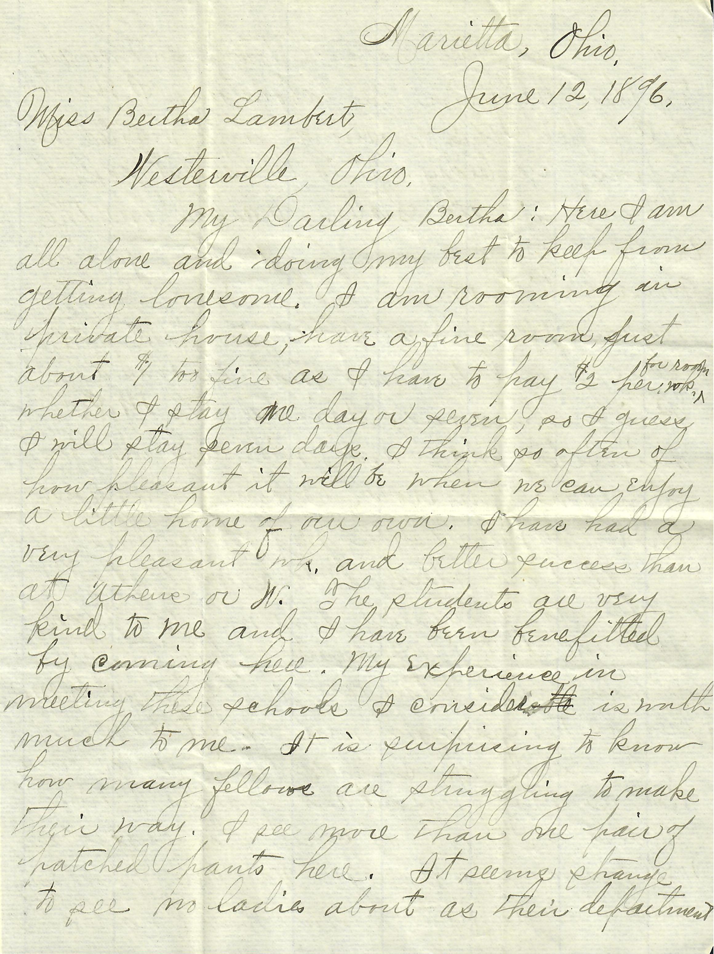 My Darling Bertha: Here I am all alone and doing my best to keep from getting lonesome. I am rooming in private house, have a fine room just about $1 too fine as I have to pay $2 per. wk. for room whether I stay one day or seven, so I guess I will stay seven days. I think so often of how pleasant it will be when we can enjoy a little home of our own. I have had a very pleasant wk. and better success than at Athens or W. The students are very kind to me and I have been benefitted by coming here. My experience in meeting these schools I consider is worth much to me. It is surprising to know how many fellows are struggling to make their way. I see more than one pair of patched pants here. It seems strange to see no ladies about as their department is in another part of town so they are together only in the laboratory. I went to Chapel this morning and visited the library yesterday. It is the largest school library in the State. I called on the U.B. pastor and enjoyed his genial conversation very much. Wolf is his name. He was at Otterbein and still feels proud to know that he was a Philophronean. I visited the M.E. minister today and will call on Pres. Simpson tomorrow. I am going to see what they will do with my work here.