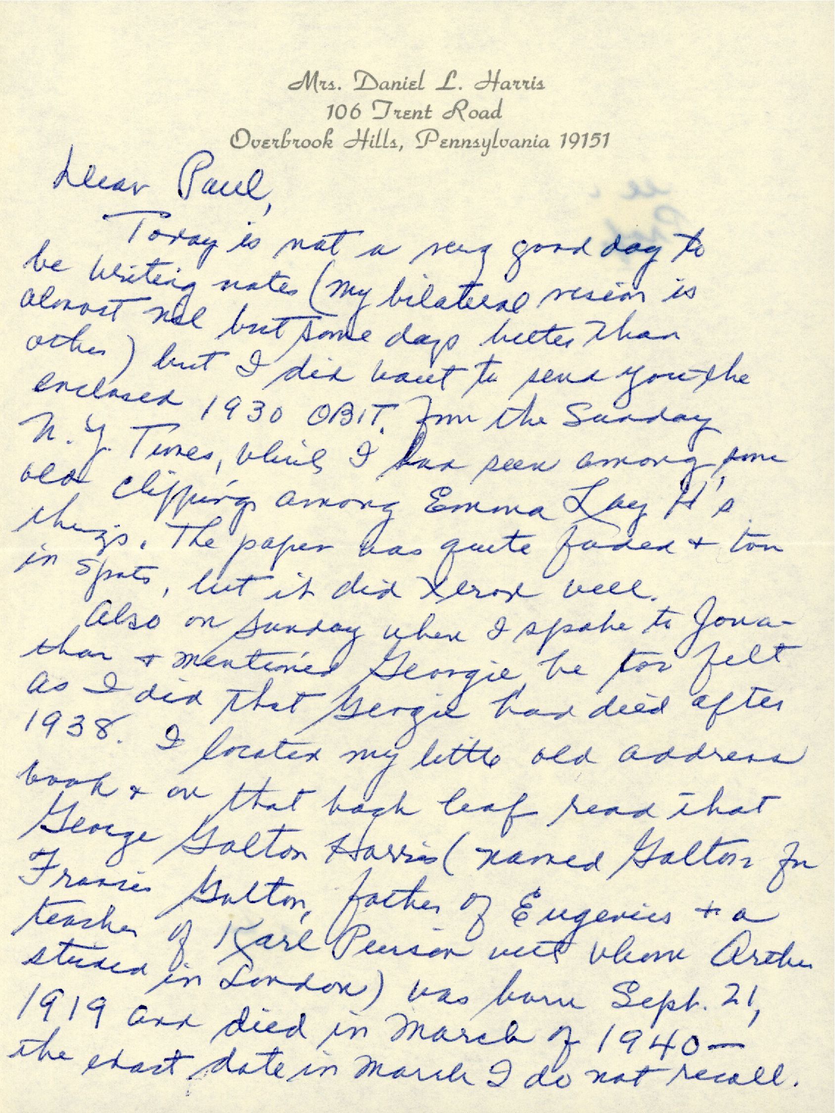 Today is not a very good day to be writing notes (my bilateral vision is almost nil but some days better that others) but I did want to send you the enclosed 1930 OBIT. from the Sunday N. Y. Times, [which] I had seen among some old clippings among Emma Lay H's things. The paper has quite faded & torn in spots, but it did Xerox well.