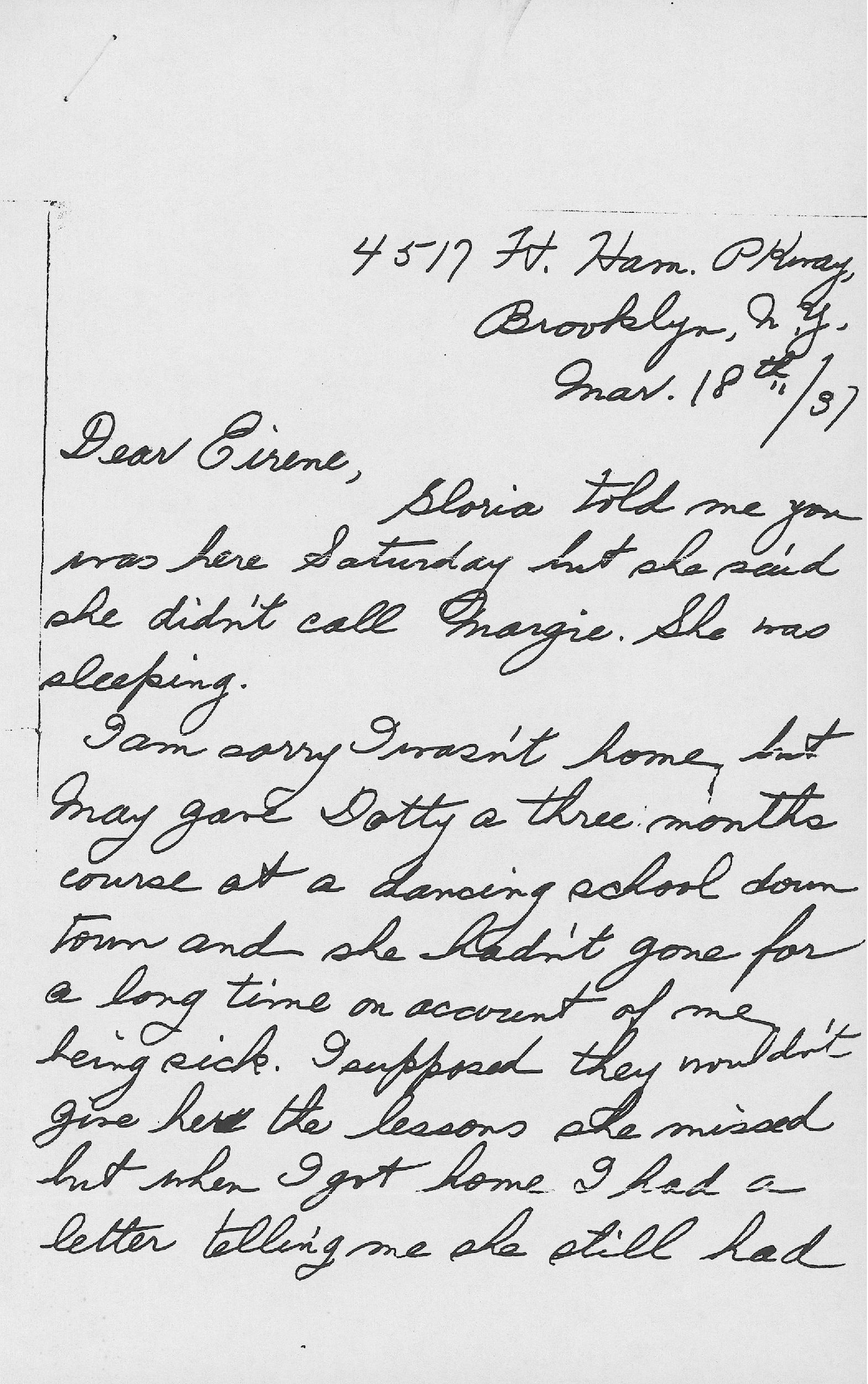 I am sorry I wasn't home, but May gave Dotty a three months course at a dancing school down town and she hadn't gone for a long time on account of me being sick. I supposed they wouldn't give her the lessons she missed but when I got home I had a letter telling me she still had lessons in her favor so I thought she might as well finish them.