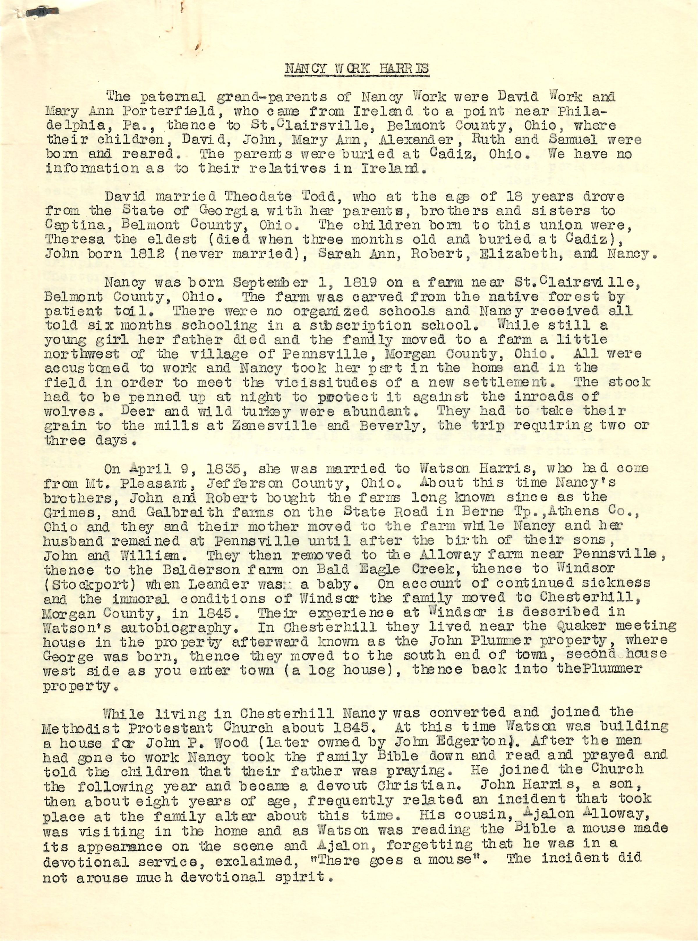 On April 9, 1835, she was married to Watson Harris, who had come from Mt. Pleasant, Jefferson County, Ohio. About this time Nancy's brothers, John and Robert bought the farms long since known as the Grimes and Galbraith farms on the State Road in Berne Tp., Athens Co., Ohio and they and their mother moved to the farm while Nancy and her husband remained at Pennsville until after the birth of their sons, John and William. They then removed to the Alloway farm near Pennsville, thence to the Balderson farm on Bald Eagle Creek, thence to Windsor (Stockport) when Leander was a baby. On account of continued sickness and the immoral conditions of Windsor the family moved to Chesterhill, Morgan County, in 1845. Their experience at Windsor is described in Watson's autobiography. In Chesterhill they lived near the Quaker meeting house in the property afterward known as the John Plummer property, where George was born, thence they moved to the south end of town, second house west side as you enter town (a log house), thence back into the Plummer property.