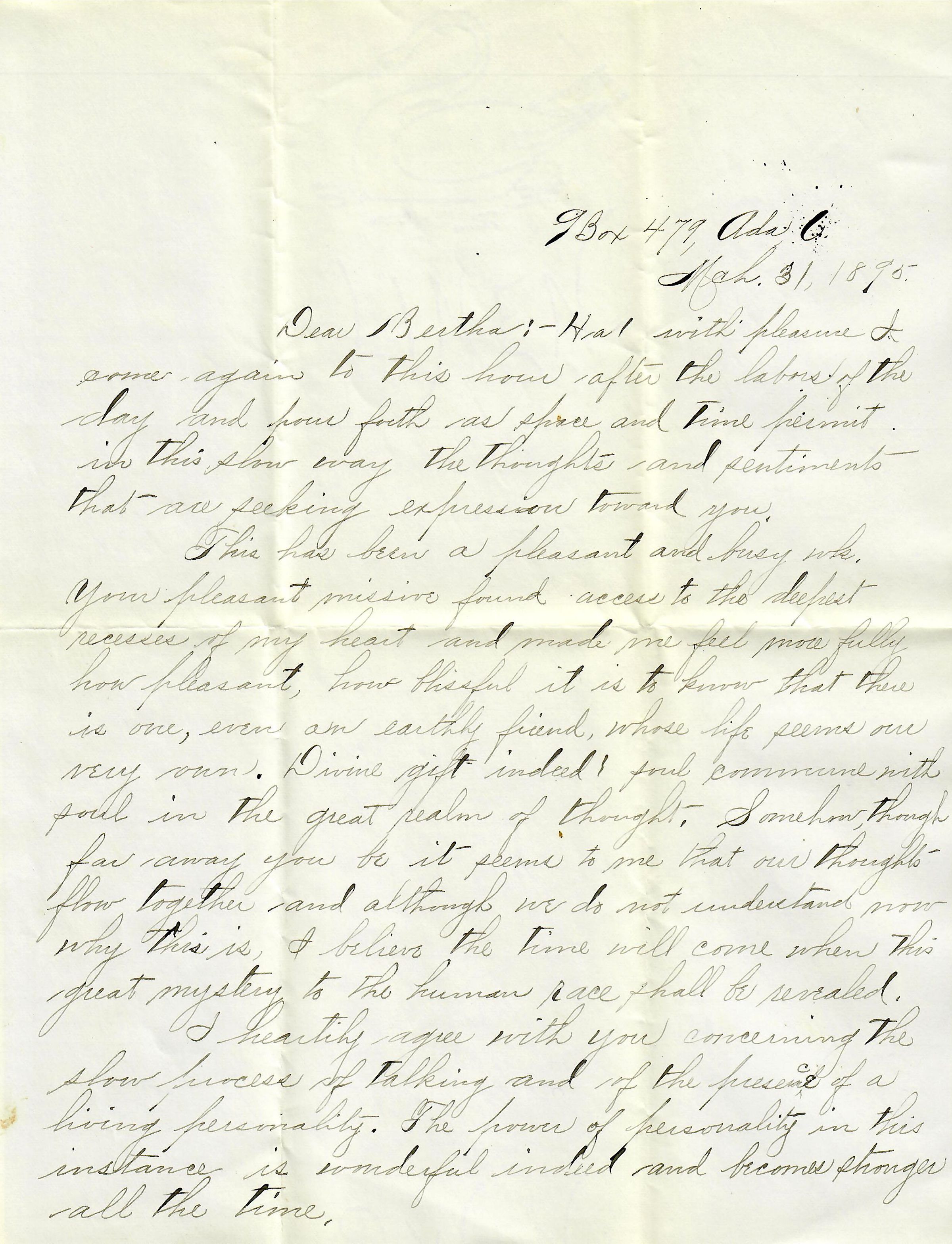 This has been a pleasant and busy wk. Your pleasant missive found access to the deepest recesses of my heart and made me feel more fully how pleasant, how blissful it is to know that there is one, even an earthly friend, whose life seems our very own. Divine gift indeed! Soul commune with soul in the great realm of thought. Somehow, though far away you be it seems to me that our thoughts flow together and although we do not understand now why this is, I believe the time will come when this great mystery to the human race shall be revealed.
