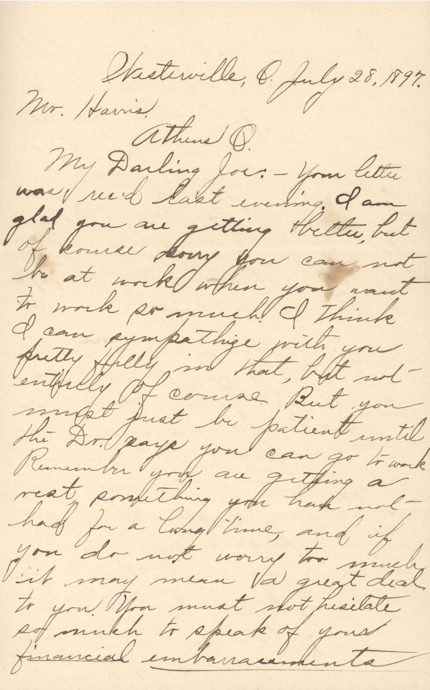 My Darling Joe: — Your letter was rec'd last evening. I am glad you are getting better, but of course sorry you can not be at work when you want to work so much. I think I can sympathize with you pretty fully in that, but not entirely of course. But you must just be patient until the Dr. says you can go to work. Remember you are getting a rest, something you have not had for a long time, and if you do not worry too much it may mean a great deal to you. You must not hesitate so much to speak of your financial embarrassments. When you get where that condition of affairs exists most of the time, as it does with some of the rest of us, you will not feel that it is such a delicate matter. Please do not hesitate to speak of such things to me, you know it is not a new subject in our home, and it does not alarm me in the least. You have done more already this summer than many of the boys who went out from here last year. I should not have expressed so much anxiety for seeing you, but do not pay any attention to that. Come when it suits you in every respect and it will be all right.