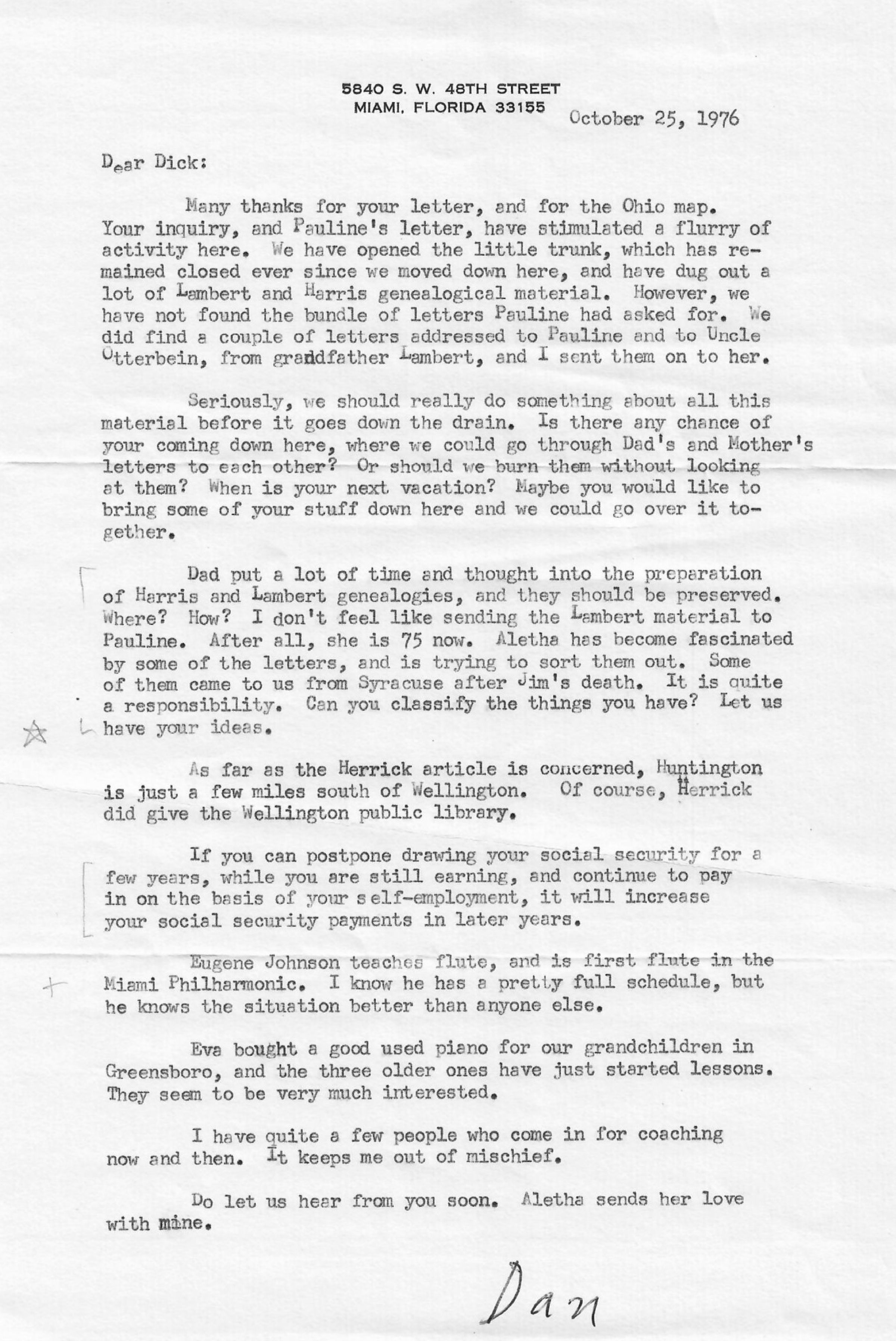 AU Harris, Daniel Alfred - 1976-10-25 letter to Richard Lambert HarrisEntry/Object ID