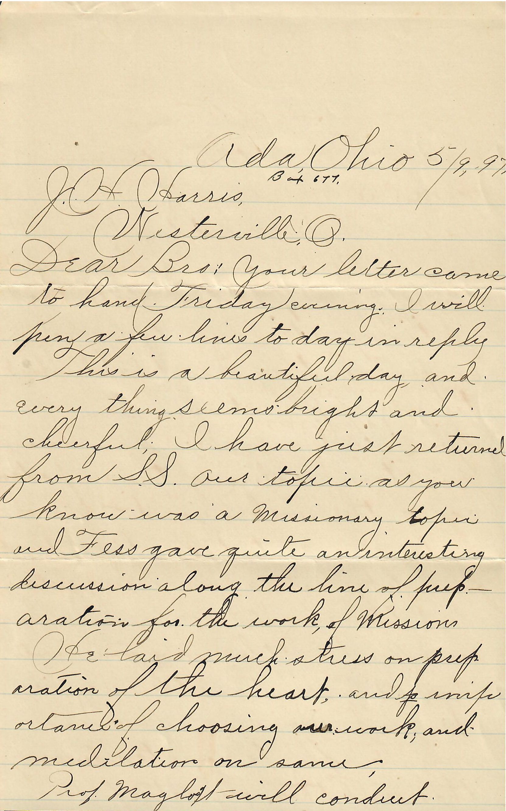 This is a beautiful day and every thing seems bright and cheerful. I have just returned from S.S. Our topic as you know was a Missionary topic and Fess gave quite an interesting discussion along the line of preparations for the work of Missions. He laid much stress on preparation of the heart and importance of choosing our work and meditations on same.