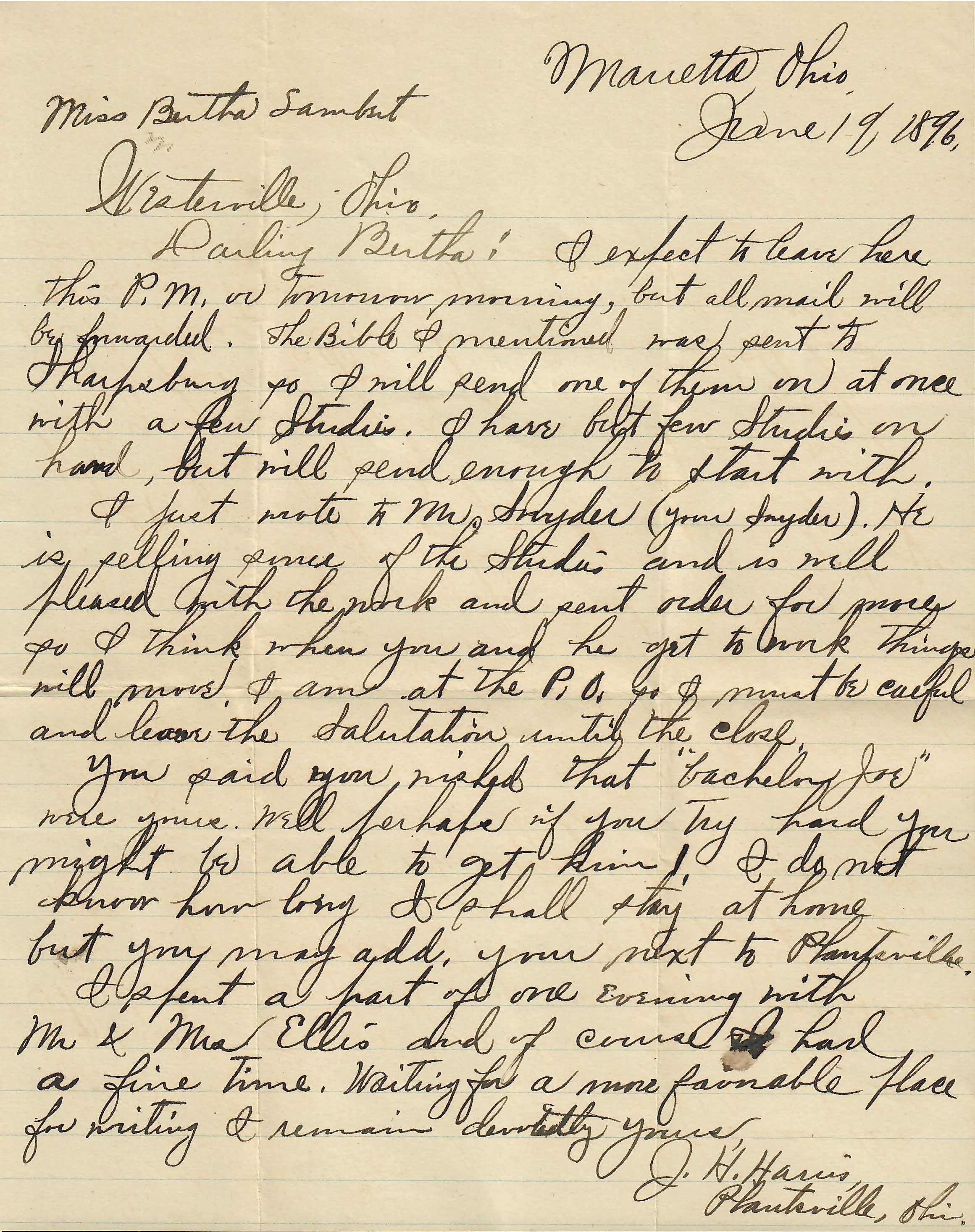 [Marietta, OH, to Miss Bertha E. Lambert, Westerville, Ohio, “Franklin Co.”]