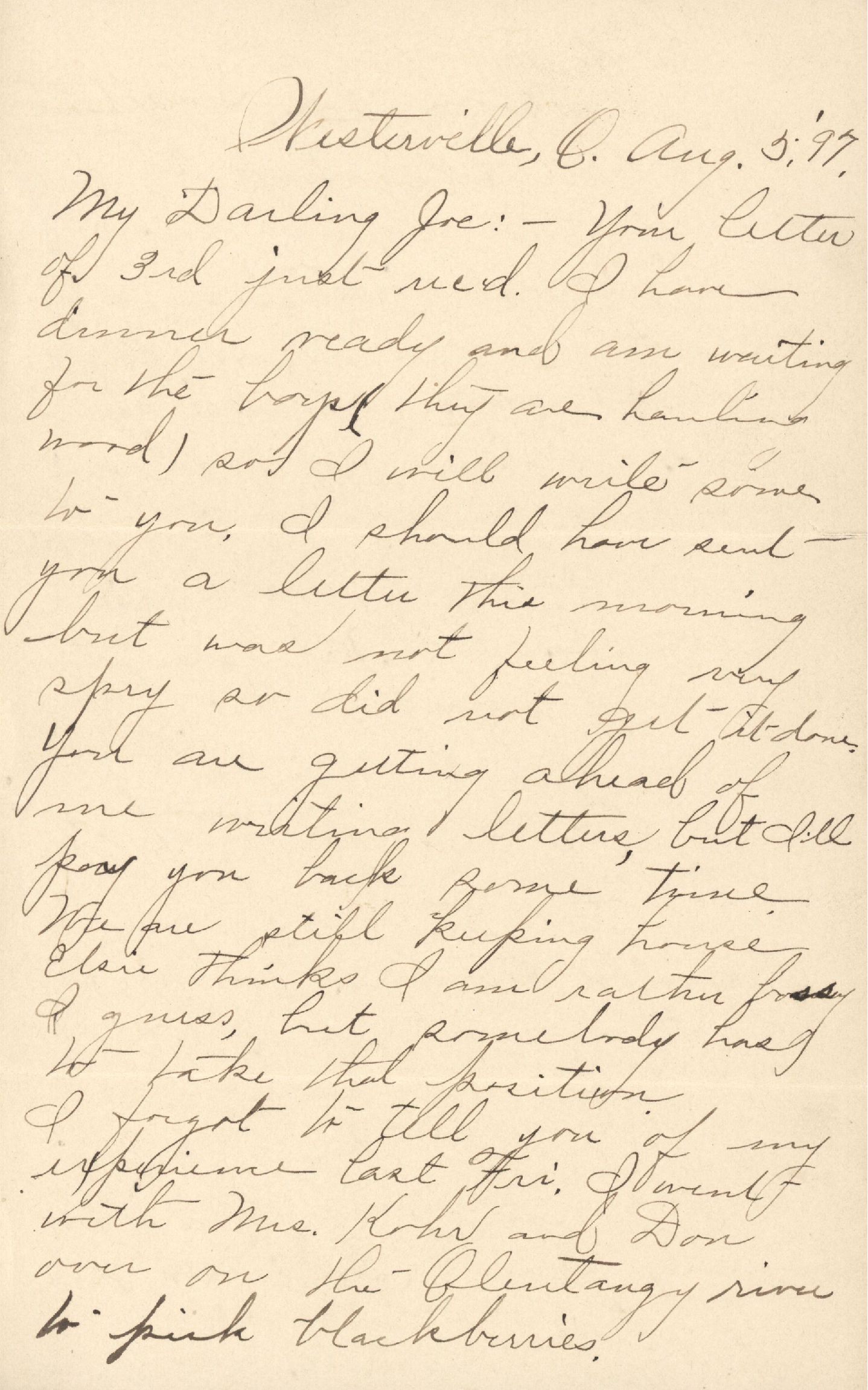 I forgot to tell you of my experience last Fri. I went with Mrs. Kohr and Don over on the Olentangy river to pick blackberries. We went early in the morning and stayed all day. It was a lovely ride and we got about two bushel of berries and “jigger bites” enough to last all summer. I spent Sat. forenoon canning berries. I am so glad you can go to work again. You know how to appreciate it now surely. I have thought so much about you in your suffering and thought if I could only be with you in a home of our own you would not mind it so much. I hardly know what to say about school work, but I dislike very much to think of you being out of school. This year, I would much rather you would borrow the money of some one if you can and be in school. I do not like to think of you being out at work unless I could be with you, and I hardly like for us to marry this fall and be out of school for fear something would prevent you finishing your college course.