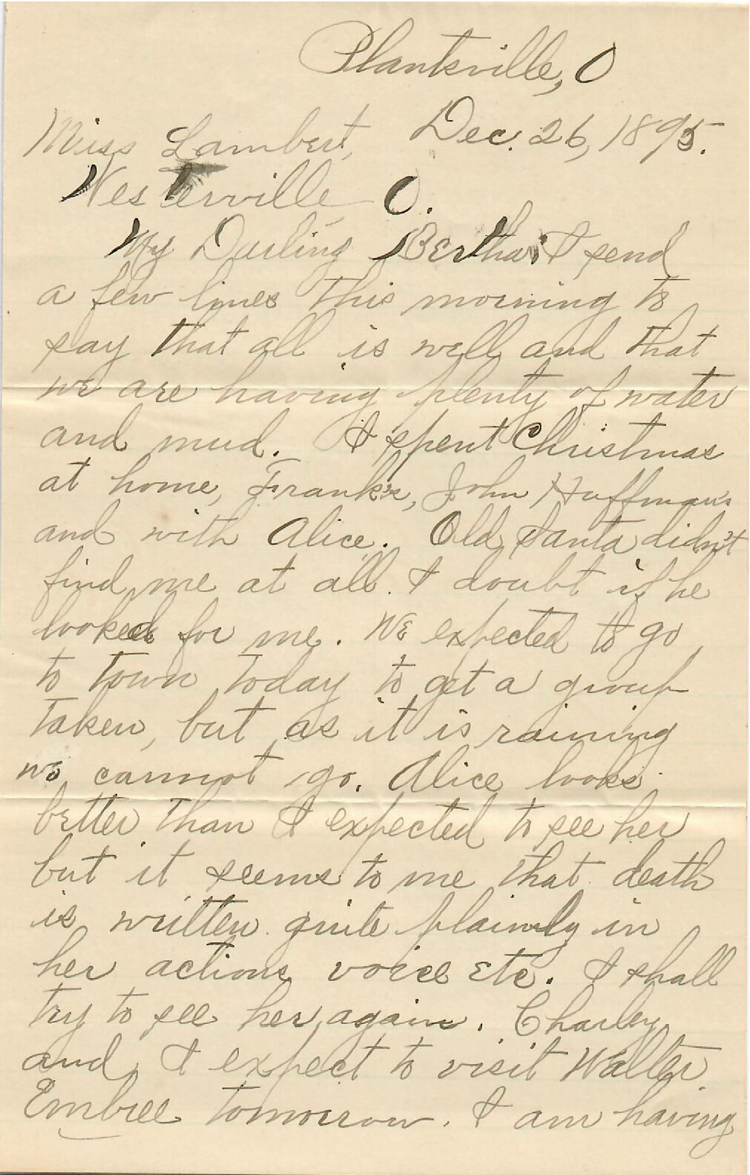 My Darling Bertha: I send a few lines this morning to say that all is well and that we are having plenty of water and mud. I spent Christmas at home, Frank's, John Huffman's and with Alice. Old Santa didn't find me at all. I doubt if he looked for me. We expected to go to town today to get a group taken, but as it is raining we cannot go. Alice looks better than I expected to see her but it seems to me that death is written quite plainly in her actions, voice etc. I shall try to see her again. Charley and I expect to visit Walter Embree tomorrow. I am having a nice time, but am anxious to see you. I suppose you have considerable company now and are looking for more. I thought some of calling on you Friday evening, but will give you a little rest and wait until Sat. and then you may keep me as long as you like until Jan. 11. If I come Sat. it will be near night before reaching you. I hope you are having a nice time. Doubtless you got my letter written from Palos and perhaps there is a letter at the office for me if I can find a boat to row over there after a while. O my I have a good one on you, perhaps you have heard it ere this, but it makes me smile to think of it. I felt rather disappointed because no one congratulated me nor did they inquire about my sweetheart much {ei} in that sense. They seem to be afraid of me, but you are a brave (?) little girl since our Lake Erie experience. I gathered some posies yesterday. My visit is about out now and I begin to feel that I am in the people's way, they want to use me too well.