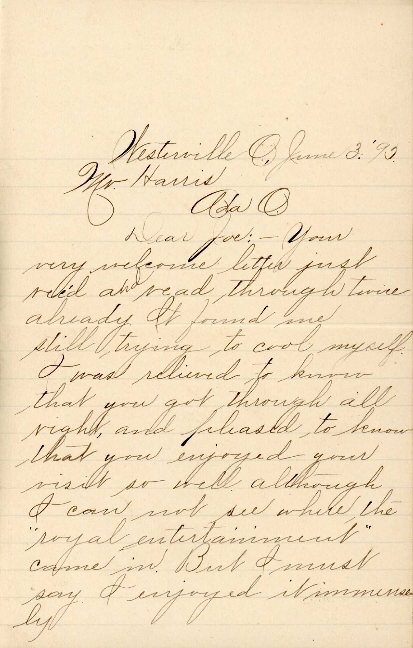 Dear Joe:- Your very welcome letter just rec'd and read through twice already. It found me still trying to cool myself. I was relieved to know that you got through all right and pleased to know that you enjoyed your visit so well although I can not see where the "royal entertainment" came in. But I must say I enjoyed it immensely.