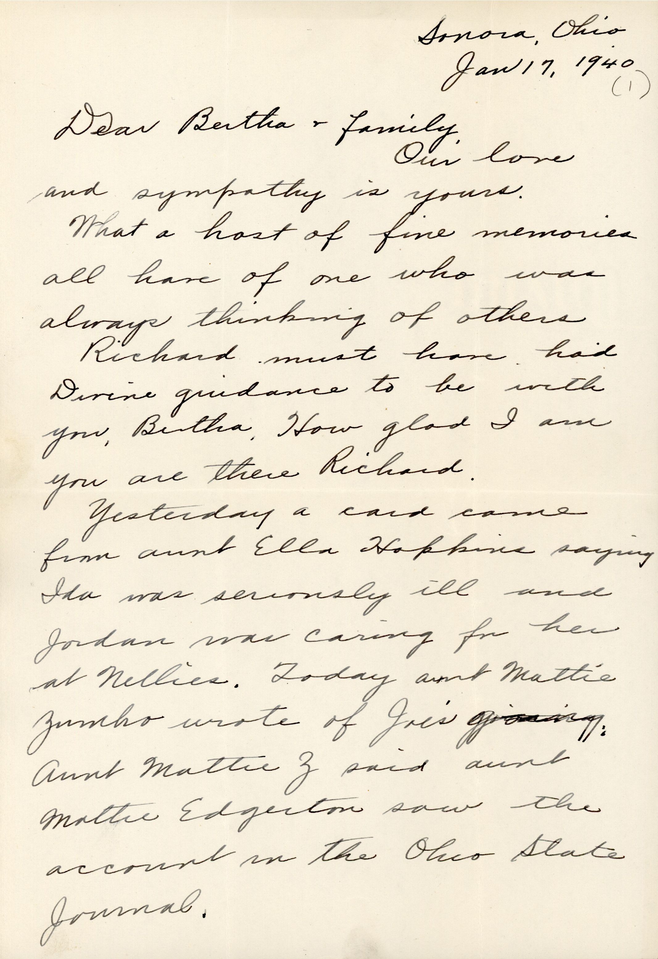 Yesterday a card came from aunt Ella Hopkins saying Ida was seriously ill and Jordan was caring for her at Nellie's. Today aunt Mattie Zumbro wrote of Joe's passing. Aunt Mattie Z said aunt Mattie Edgerton saw the account in the Ohio State Journal. All yesterday I thought of calling Ira & asking for Ida's address. I said to mother we'd write. We kept talking of you throughout the day. When today the sad news came I immediately called Ira (We have free service to Dresden now) and he told me of being over there and the fact that Richard was with you.