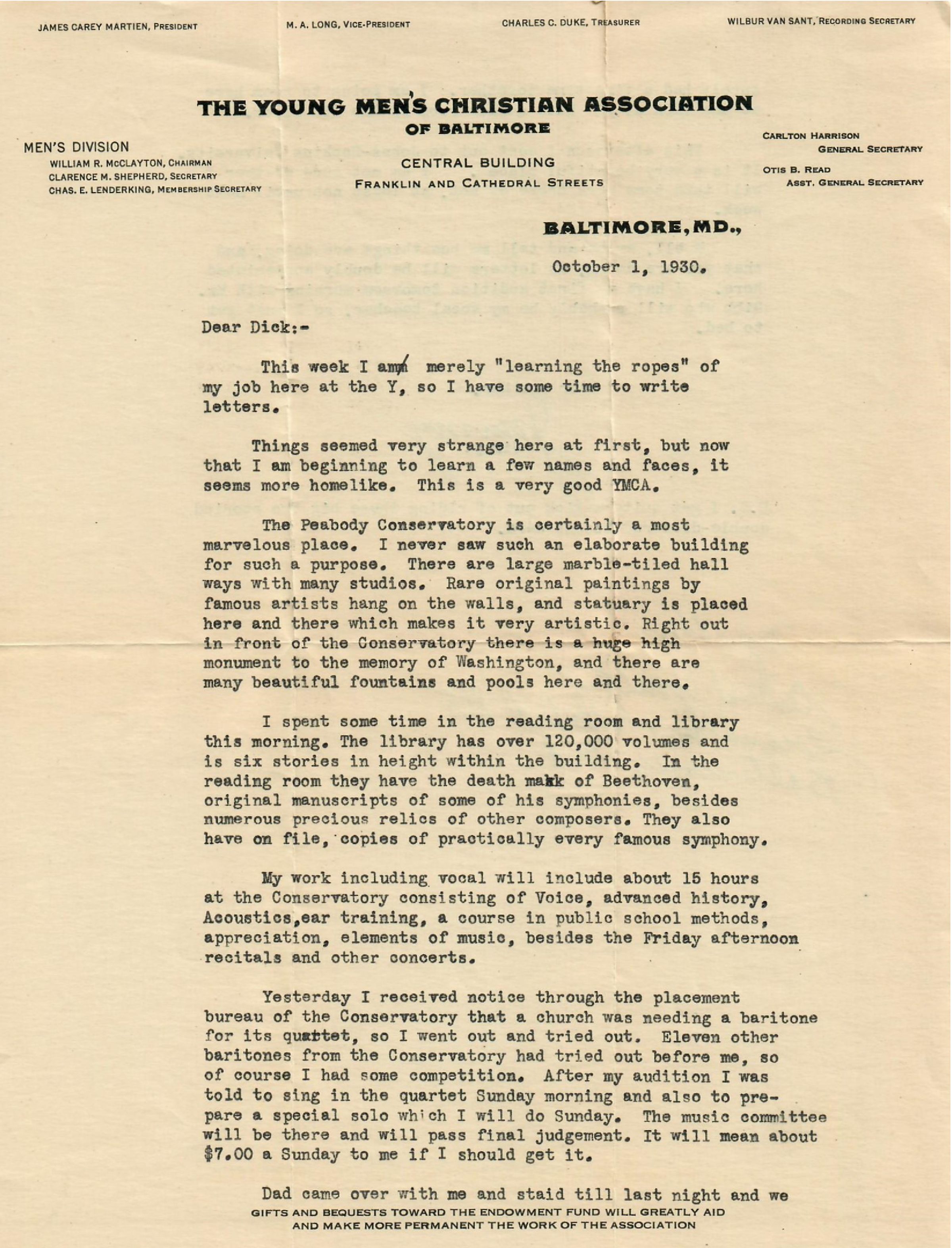 Yesterday I received notice through the placement bureau of the Conservatory that a church was needing a baritone for its quartet, so I went out and tried out. Eleven other baritones from the Conservatory had tried out before me, so of course I had some competition. After my audition I was told to sing in the quartet Sunday morning and also to prepare a special solo which I will do Sunday. The music committee will be there and will pass final judgement. It will mean about $7.00 a Sunday to me if I should get it.
