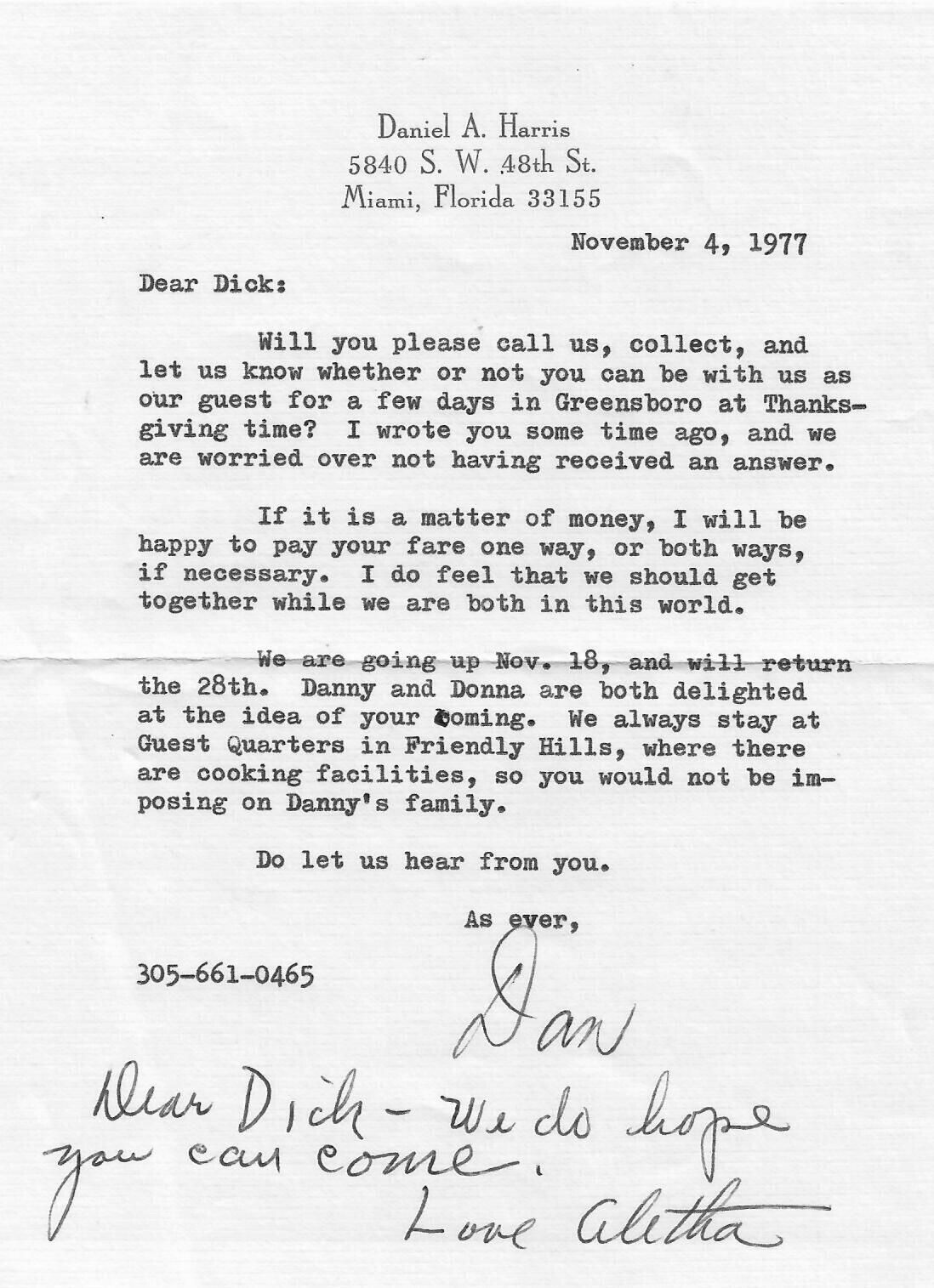 Will you please call us, collect, and let us know whether or not you can be with us as our guest for a few days in Greensboro at Thanksgiving time? I wrote you some time ago, and we are worried over not having received an answer.