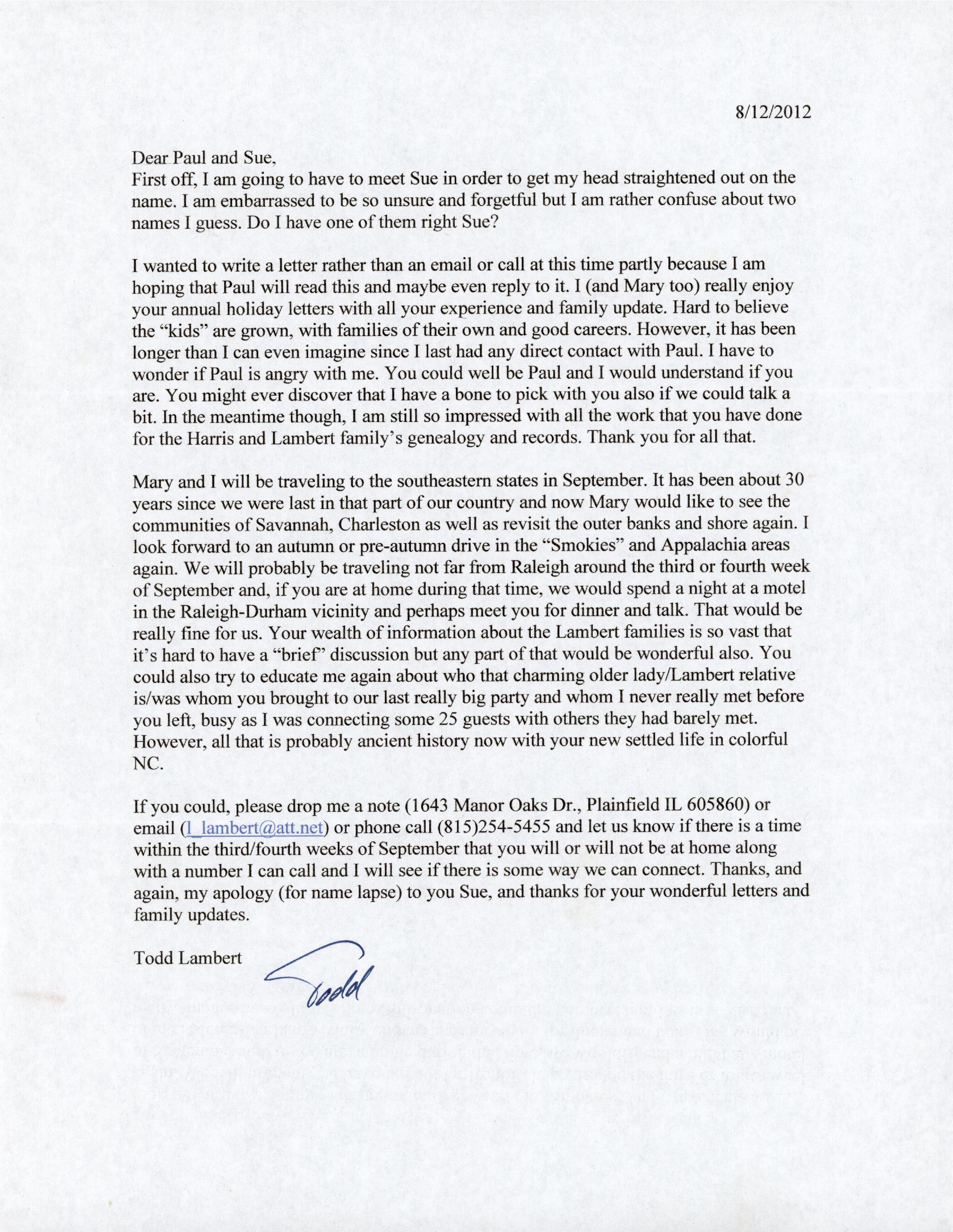If you could, please drop me a note (1643 Manor Oaks Dr., Plainfield IL 605860) or email (l_lambert@att.net) or phone call (815) 254-5455 and let us know if there is a time within the third/fourth weeks of September that you will or will not be at home along with a number I can call and I will see if there is some way we can connect. Thanks, and again, my apology (for name lapse) to you Sue, and thanks for your wonderful letters and family updates.