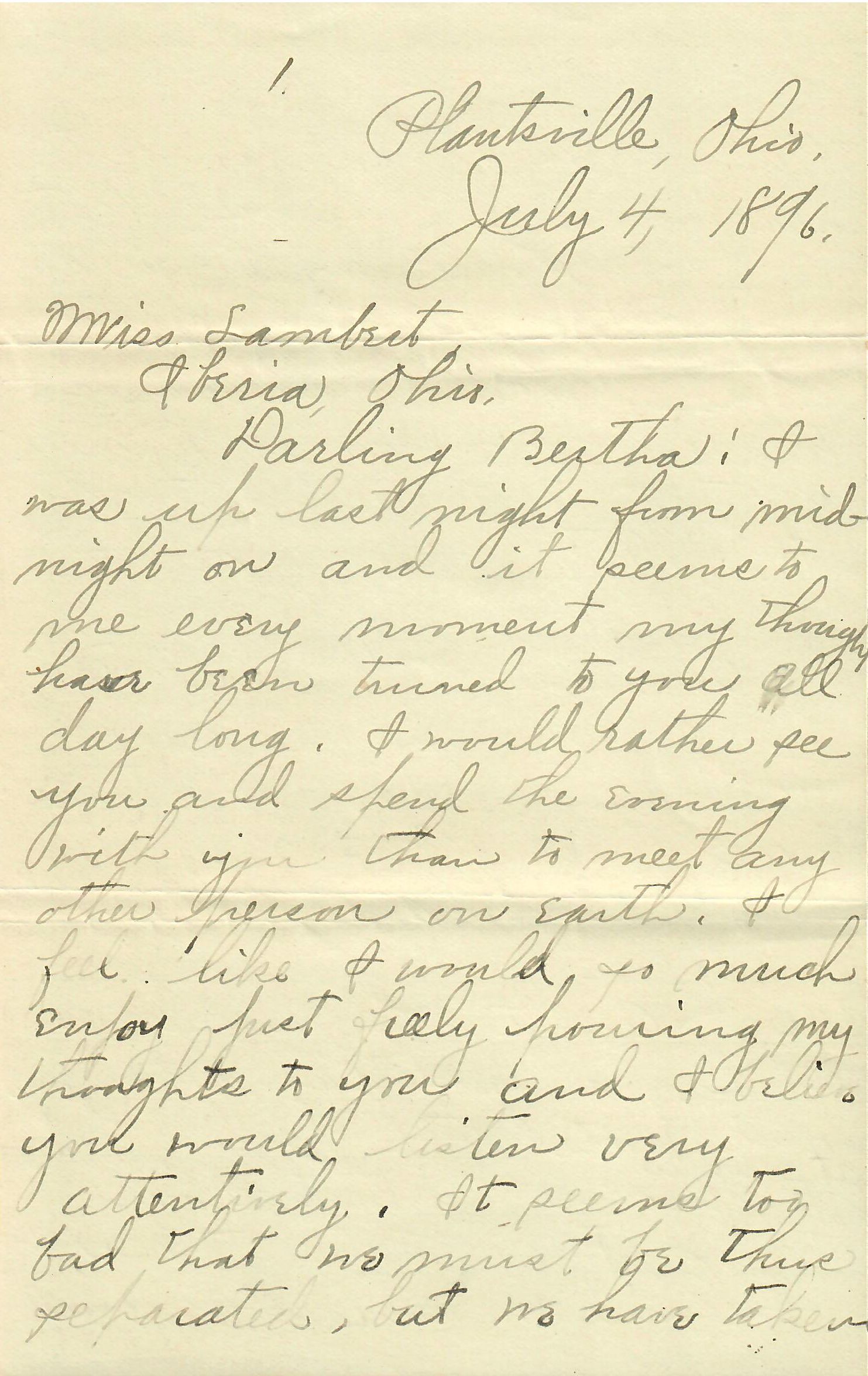 [Plantsville, OH, to Miss Bertha E. Lambert, Iberia, Ohio, “Morrow Co.”]
