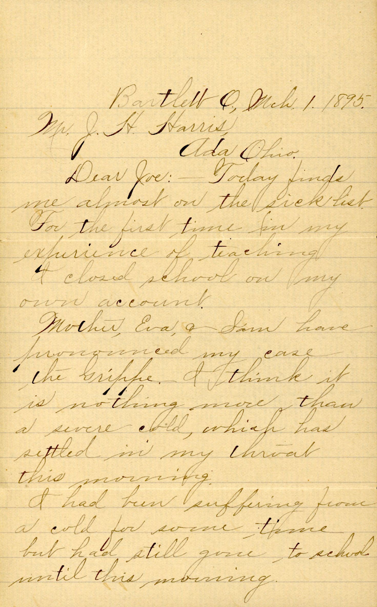 [Bartlett, Ohio, to Mr. J. H. Harris, Ada, Ohio, Box 479]