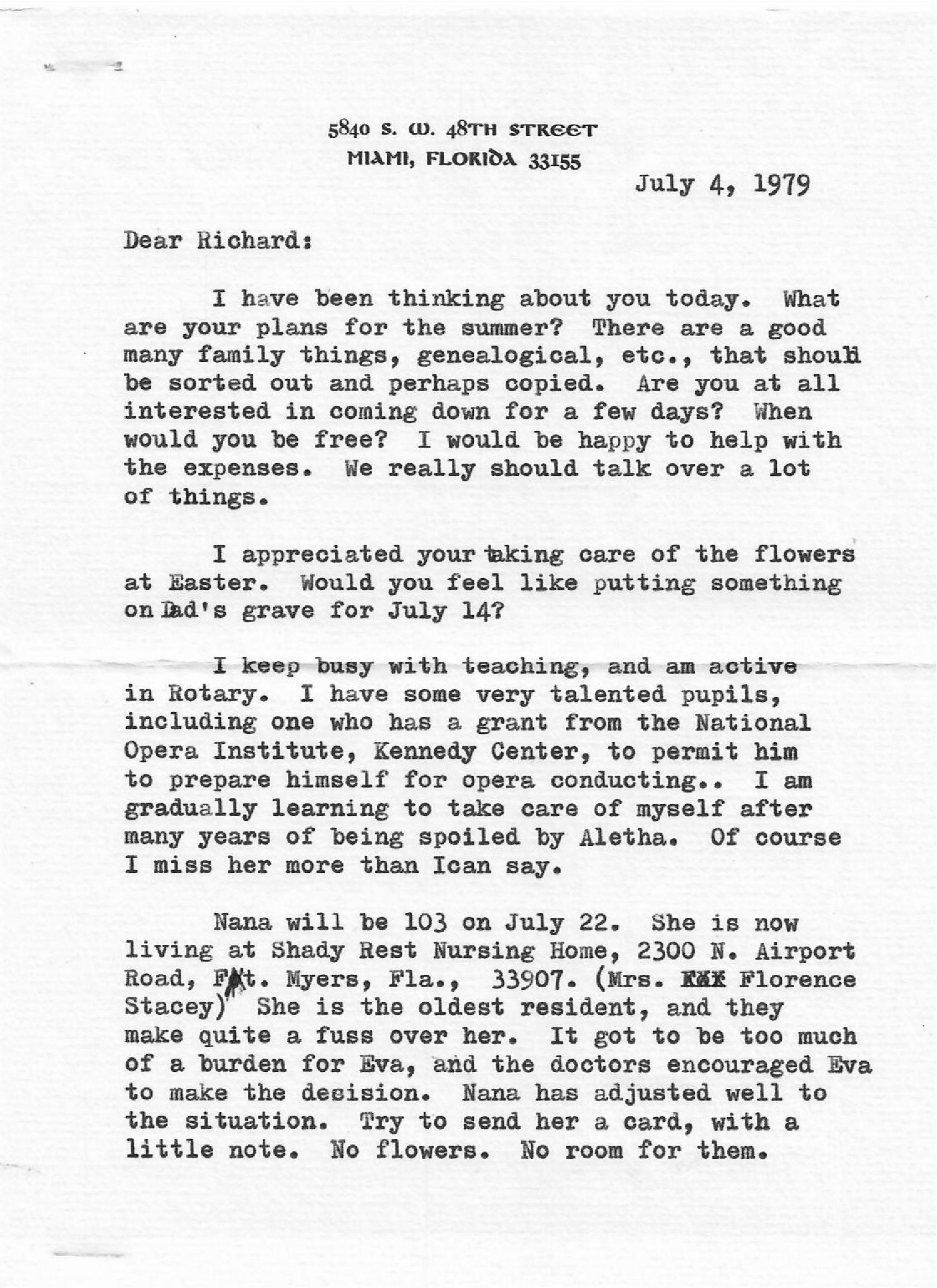 Nana will be 103 on July 22. She is now living at Shady Rest Nursing Home, 2300 N. Airport Road, Ft. Myers, Fla., 33907. (Mrs. Florence Stacey) She is the oldest resident, and they make quite a fuss over her. It go to be too much of a burden for Eva, and the doctors encouraged Eva to make the decision. Nana has adjusted well to the situation. Try to send her a card, with a little note. No flowers. Nor room for them.
