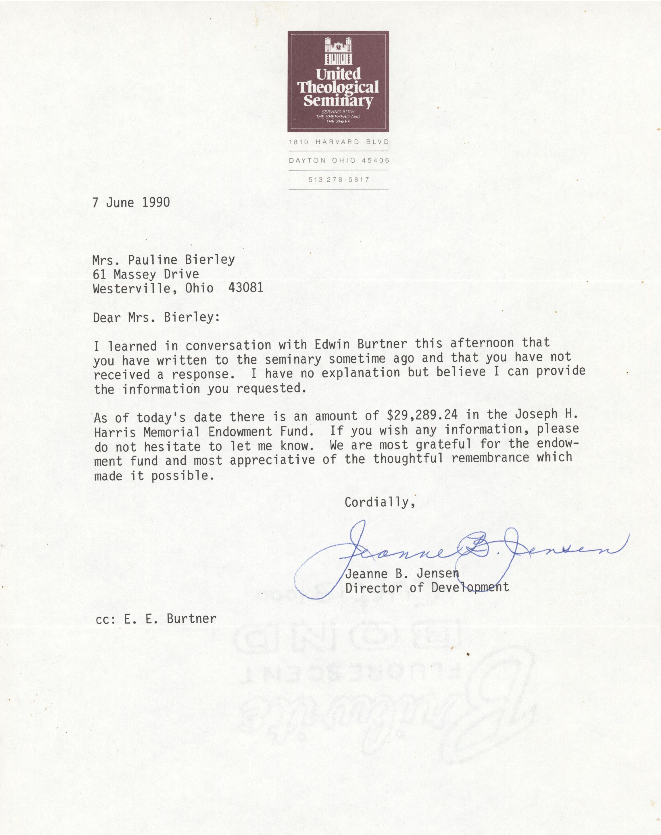 AU Jensen, Jeanne B. - 1990-06-07 letter to Mrs. Pauline BierleyEntry/Object ID