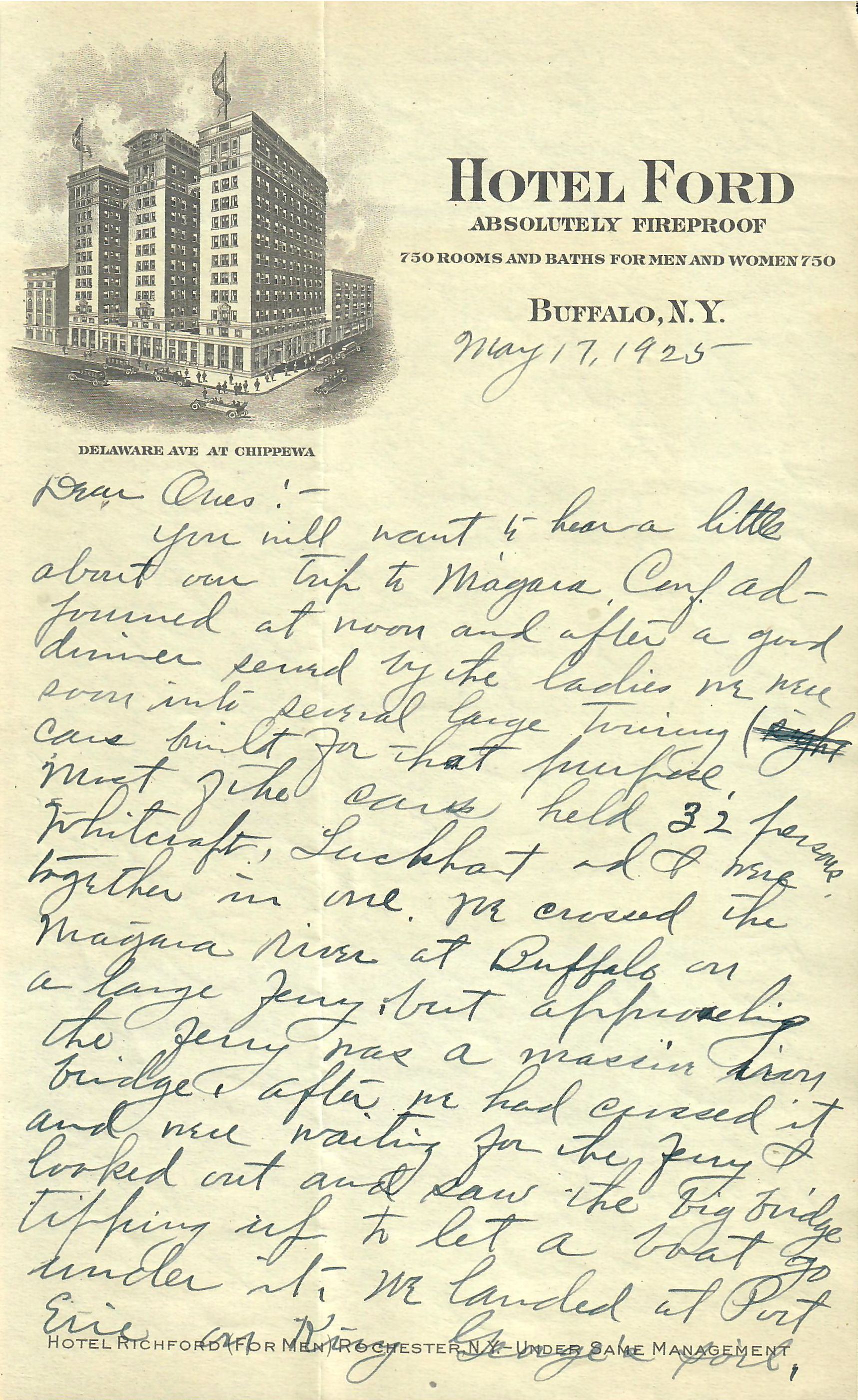 You will want to hear a little about our trip to Niagara. Conf. adjourned at noon and after a good dinner served by the ladies we were soon into several large touring cars built for that purpose. Most of the cars held 32 persons. Whitcraft, Lockhart and I were together in one. We crossed the Niagara River at Buffalo on a large ferry, but approaching the ferry was a massive iron bridge. After we had crossed it and were waiting for the ferry I looked out and saw the big bridge tipping up to let a boat go under it. We landed at Port Erie on King George's soil. Here the customs officers inspected every auto. Our driver of course stood good for us. These were special policeman on motorcycles to accompany our party. It was a beautiful drive along the Niagara River. We came to the scene of the battle of Lundy's Lane near the Falls. Now we come to the rapids, the water rushing and plunging seemingly making a race to see which one could jump over the falls first. Out in the rapids lay two wrecked boats, one broke loose from Chippewa just above, about three years ago with no one on board, the other had two men on it who after considerable delay were rescued. The boats lodged against the rocks. What a sight! 11 million cubic ft of water per sec plunging 163 ft. The foam and mist as the result of the churning rises seemingly to nearly the top of the falls (on Canadian side). 94% of the water is on the Canadian side. Many of our party (250) went into the tunnel back of the falls. I did not go in. I preferred looking at the falls. "The Maid of the Mist," a boat came struggling up to see how near she could get to the torrent without being swept in. Many people were on board. The mist there is same as a rain and rises high above the falls. We go on to what they call the whirlpool. I went down the inclined elevator. Twelve could ride on a car. There were two tracks with two cars. A man and wife were in seat with me. The lady sitting next to me, when the car started down the lady gasped and grabbed my arm with her right hand and her husband with her left hand. After a bit she came to consciousness and realized that she was hanging on to two men and then of course the apologies were profuse and the husband and I had a hearty laugh.