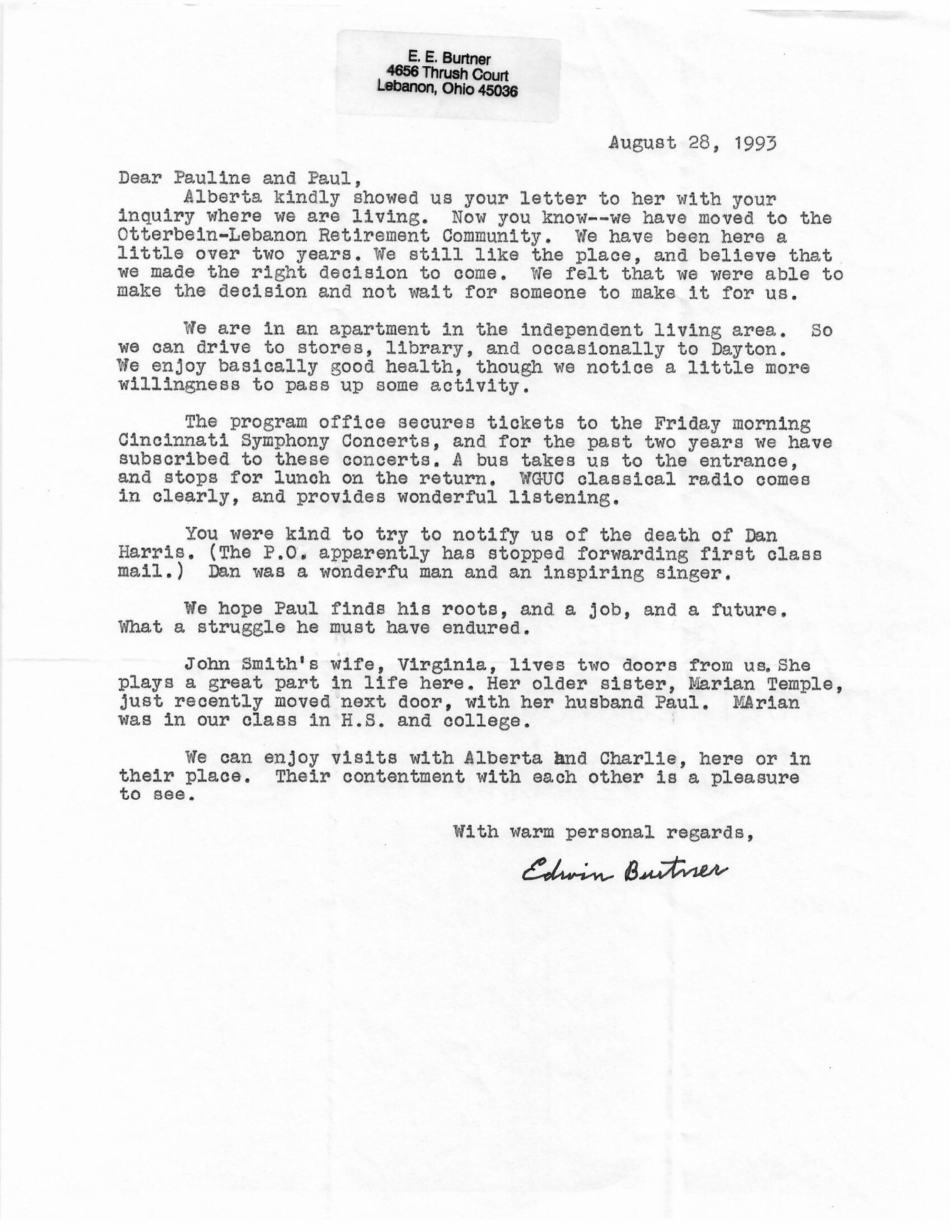 AU Burtner, Edwin E. - 1993-08-28 letter to Pauline and Paul Bierley