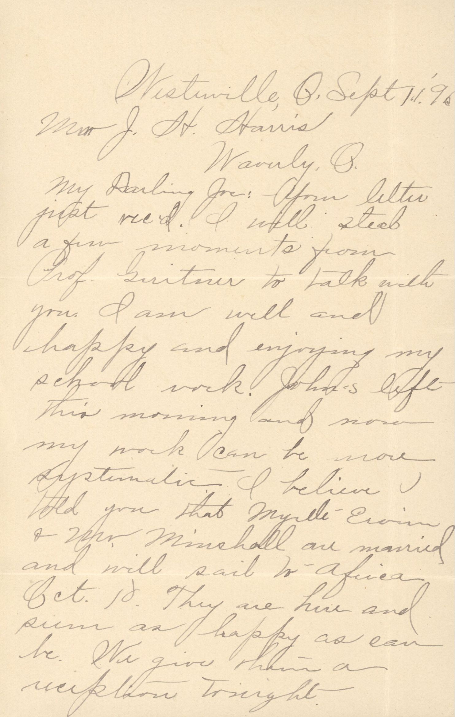 My Darling Joe: — Your letter just rec'd. I will steal a few moments from Prof. Guitner to talk with you. I am well and happy and enjoying my school work. John's left this morning and now my work can be more systematic. I believe I told you that Myrtle Ervin & Mr. Minshall are married and will sail to Africa Oct. 10. They are here and seem as happy as can be. We give them a reception tonight.