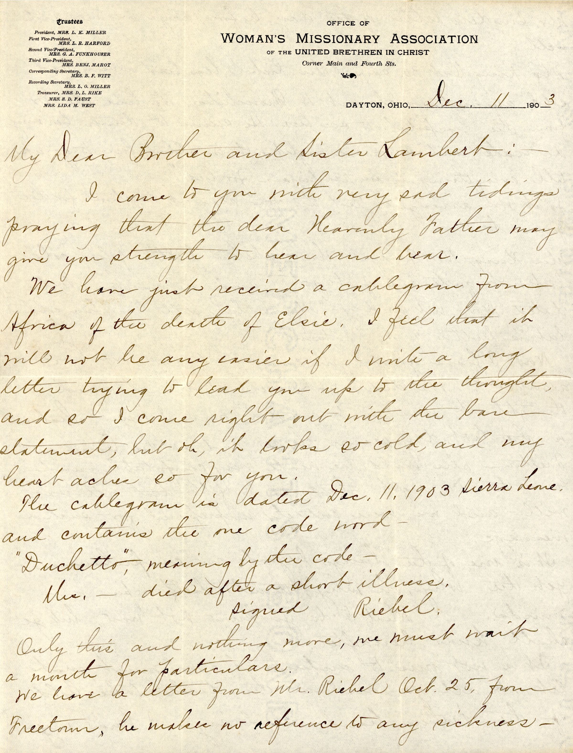 We have just received a cablegram from Africa of the death of Elsie. I feel that it will not be any easier if I write a long letter trying to lead you up to the thought, and so I come right out with the bare statements, but oh, it looks so cold, and my heart aches so for you.
