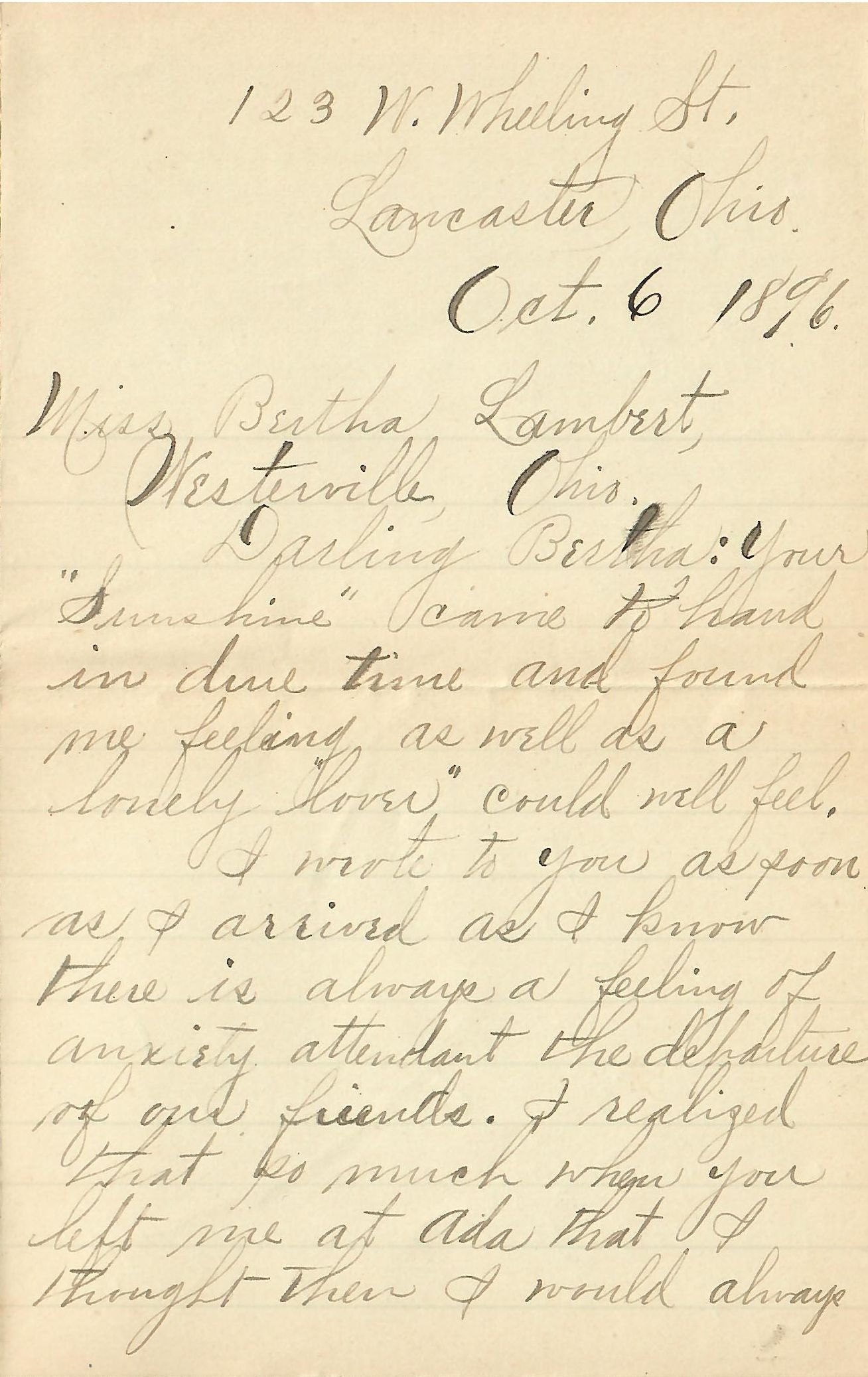 [Lancaster, OH, to Miss Bertha Lambert, Westerville, Ohio, “Franklin Co.”]