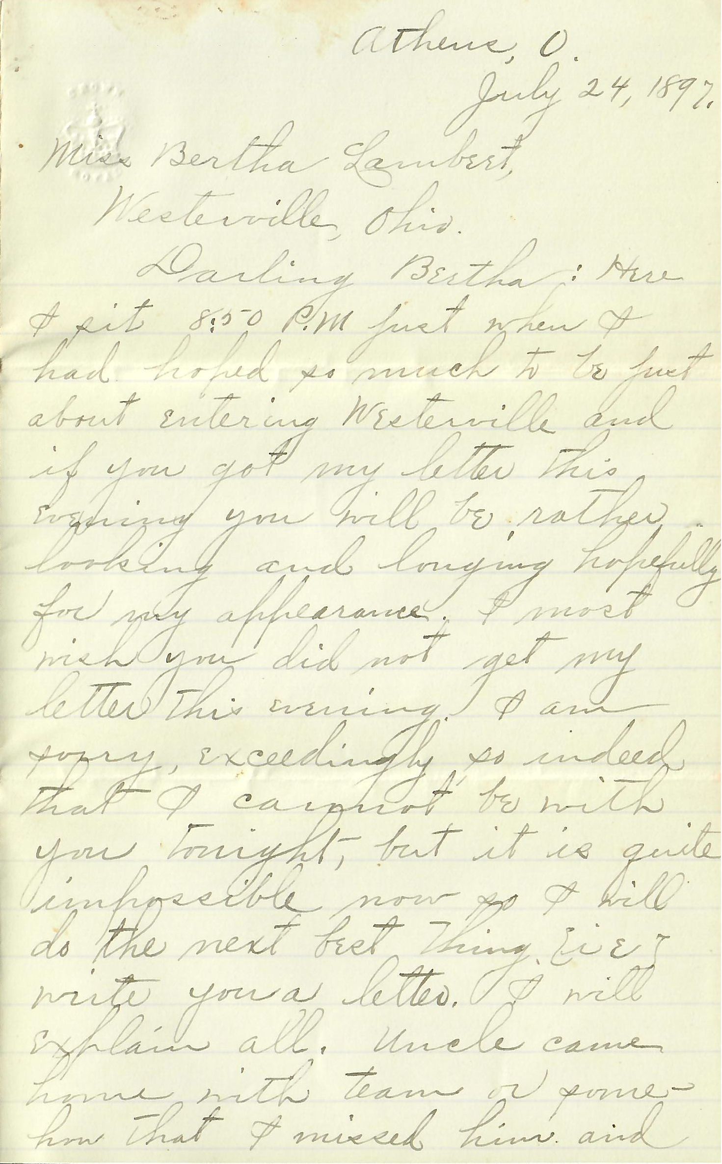 Darling Bertha: Here I sit 8:50 P.M. just when I had hoped so much to be just about entering Westerville and if you got my letter this evening you will be, rather looking and longing hopefully for my appearance. I most wish you did not get my letter this evening. I am sorry, exceedingly so indeed that I cannot be with you tonight, but it is quite impossible now so I will do the next best thing, {ie} write you a letter. I will explain all. Uncle came home with team or somehow that I missed him and he went to Trimble at once so I have not seen him at all. I came out with Charley to uncle's tonight so I am in the country again.
