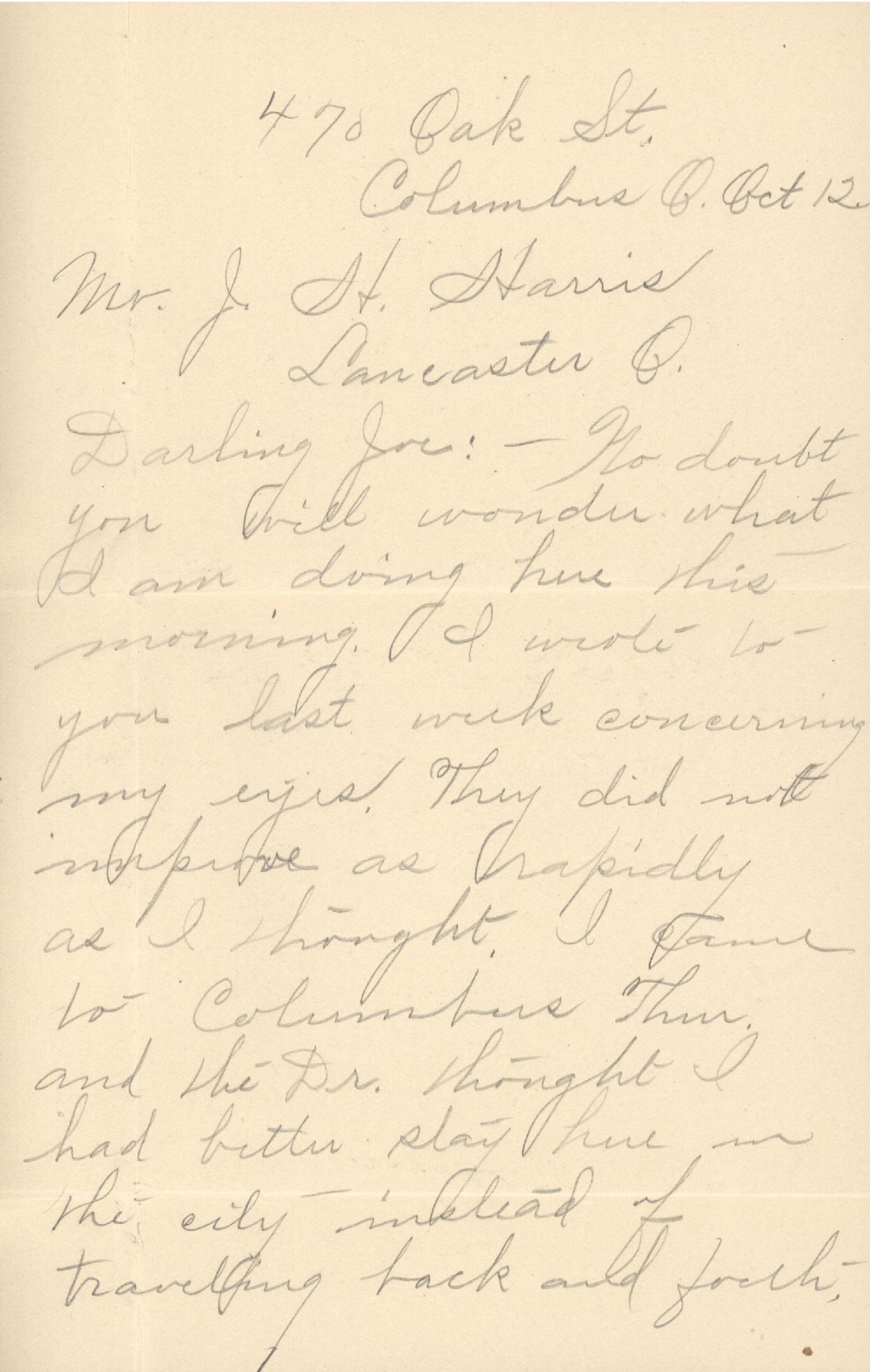 Darling Joe: — No doubt you will wonder what I am doing here this morning. I wrote to you last week concerning my eyes. They did not improve as rapidly as I thought. I came to Columbus Thur. and the Dr. thought I had better stay here in the city instead of traveling back and forth. So I am staying with Mrs. Southard an old friend of ours. My eyes are improving very rapidly and I think possibly I can go home today. Please do not worry about me for I think I can enter school again soon. I am using medicine which makes it difficult for me to see to read and write so I know you will excuse this short scratch. I will let you know if my eyes are worse so you need not worry. There are three young gentlemen here who do their best to entertain me and keep me from getting homesick.