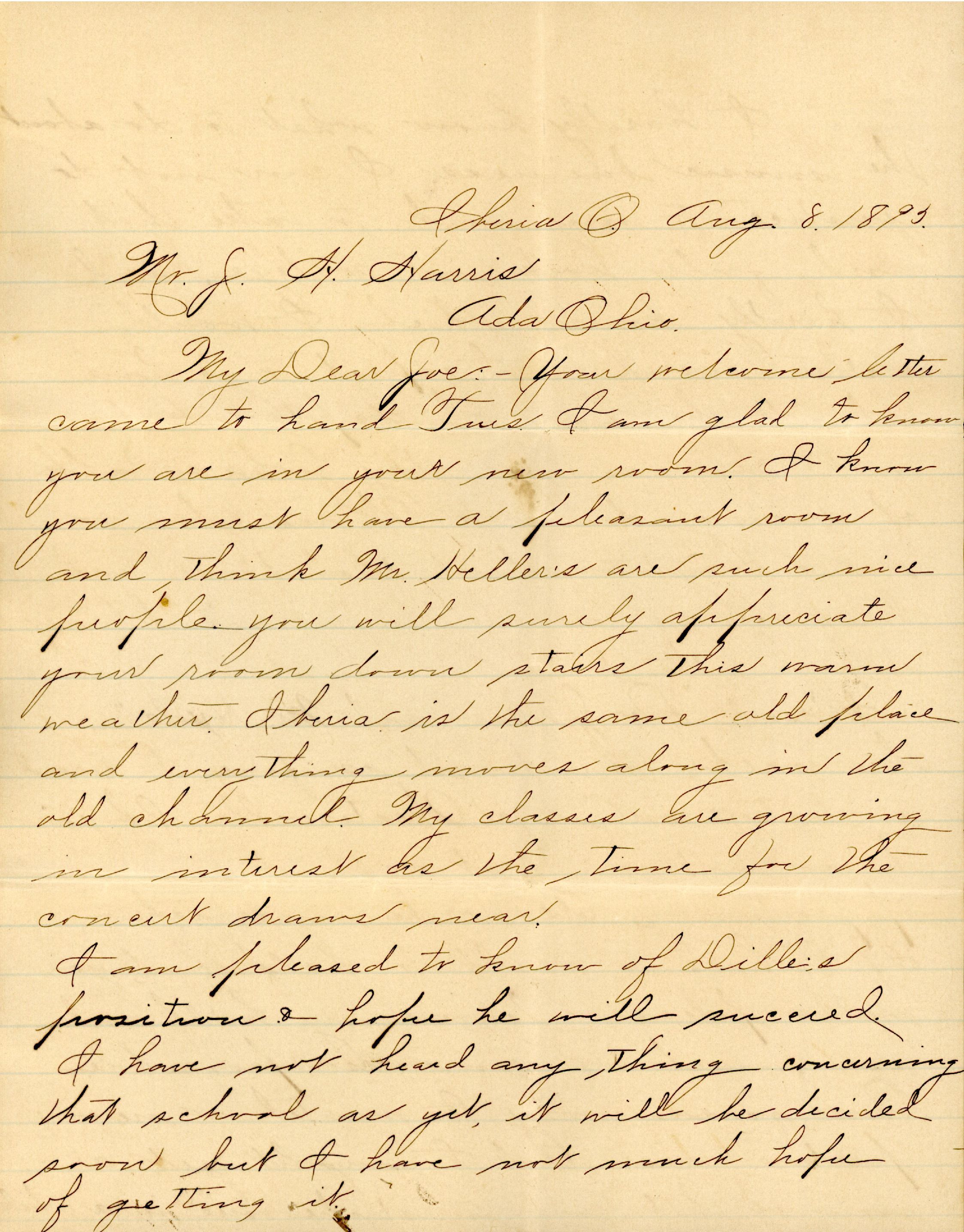 My Dear Joe: — Your welcome letter came to hand Tues. I am glad to know you are in your new room. I know you must have a pleasant room and think Mr. Heller's are such nice people. You will surely appreciate your room down stairs this warm weather. Iberia is the same old place and everything moves along in the old channel. My classes are growing in interest as the time for the concert draws near.
