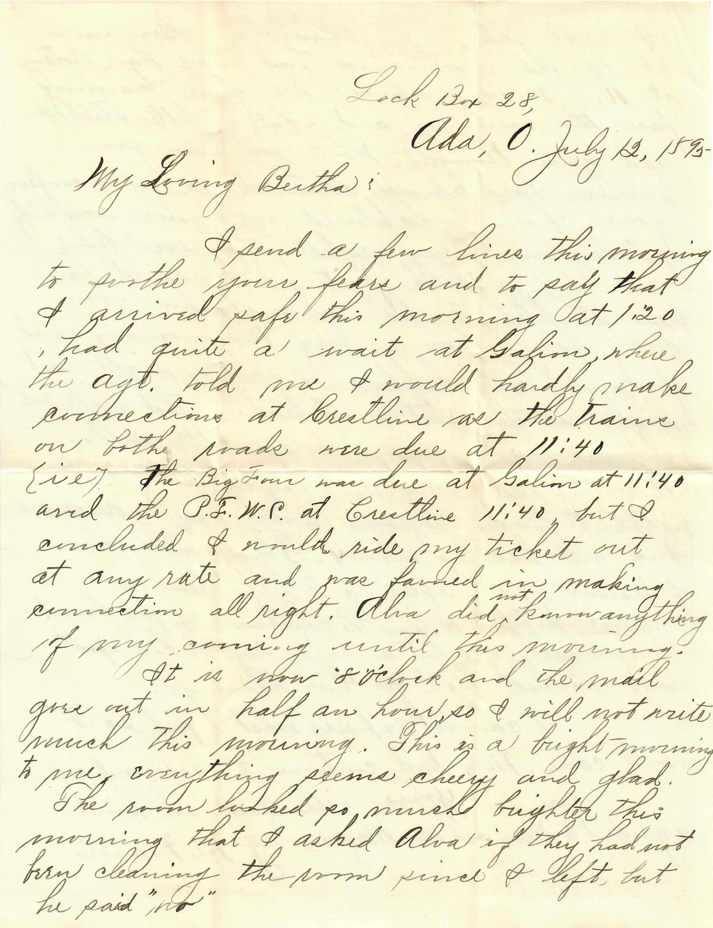 I send a few lines this morning to soothe your fears and to say that I arrived safe this morning at 1:20, had quite a wait at Galion, where the agt. told me I would hardly make connections at Crestline as the trains on both roads were due at 11:40 {ie} the Big Four was due at Galion at 11:40 and the P.T.W.C. at Crestline 11:40, but I concluded I would ride my ticket out at any rate and was favored in making connection all right. Alva did not know anything of my coming until this morning.