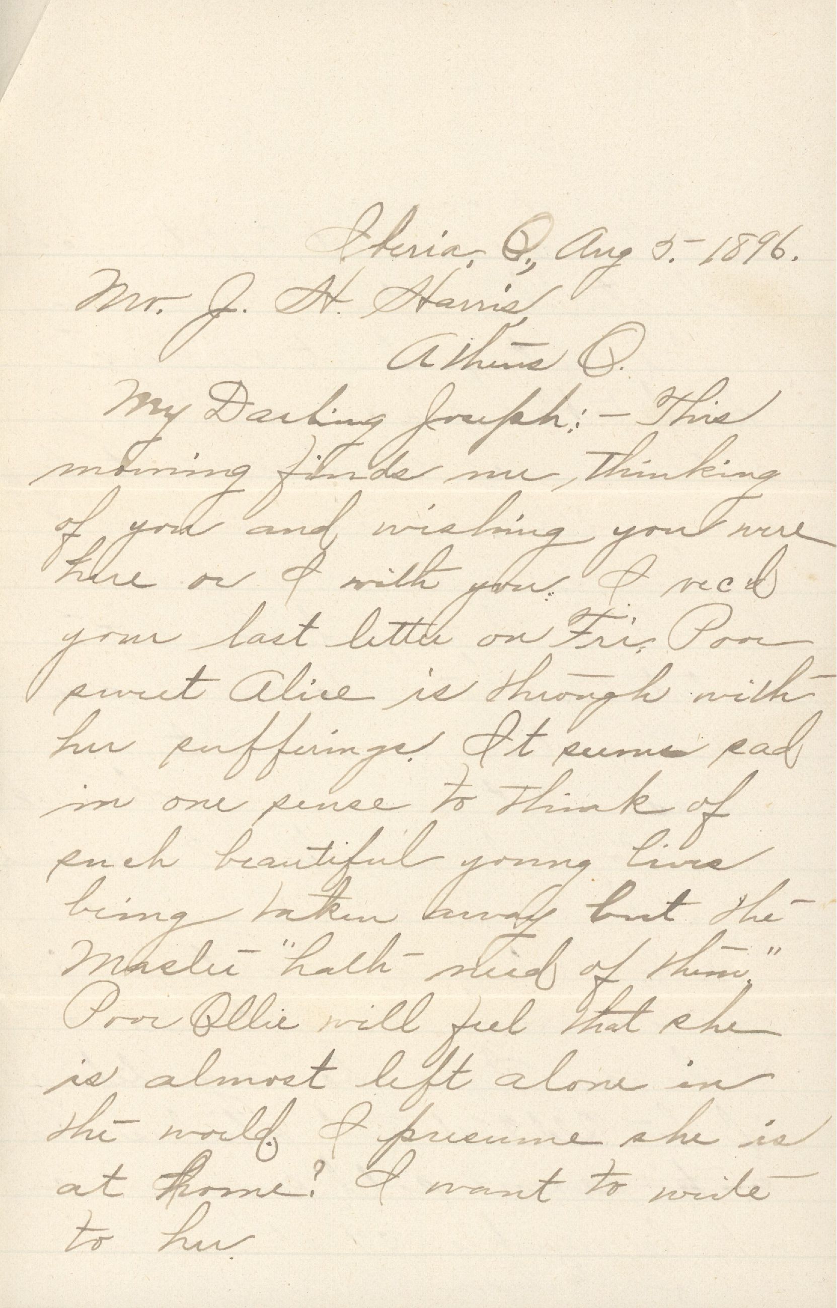 My Darling Joseph: — This morning finds me thinking of you and wishing you were here or I with you. I rec'd your last letter on Fri. Poor sweet Alice is through with her sufferings. It seems sad in one sense to think of such beautiful young lives being taken away but the Master “hath need of them.” Poor Ollie will feel that she is almost left alone in the world. I presume she is at home? I want to write to her.