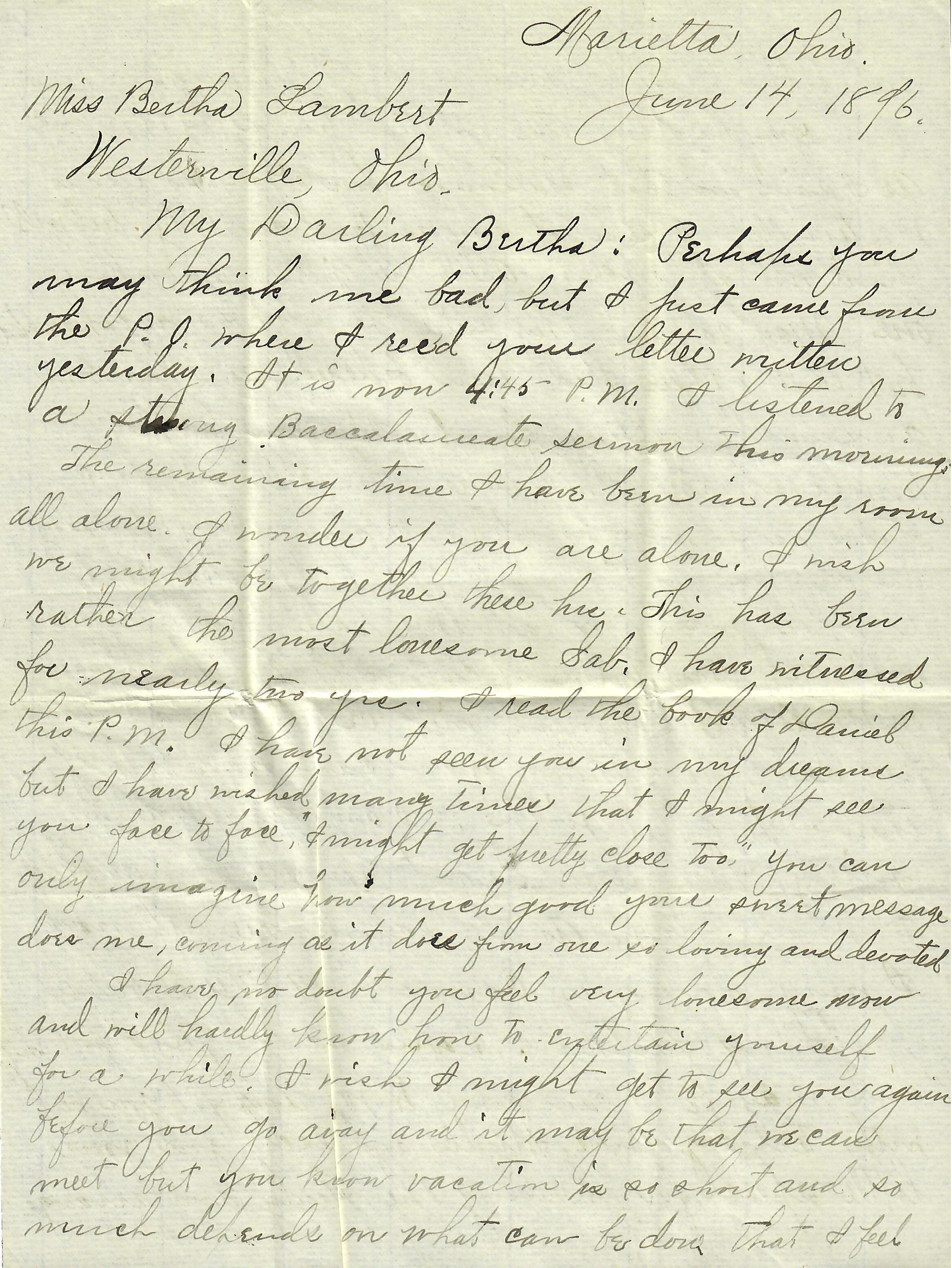 My Darling Bertha: Perhaps you may think me bad, but I just came from the P.O. where I rec'd your letter written yesterday. It is now 4:45 P.M. I listened to a strong Baccalaureate sermon this morning.