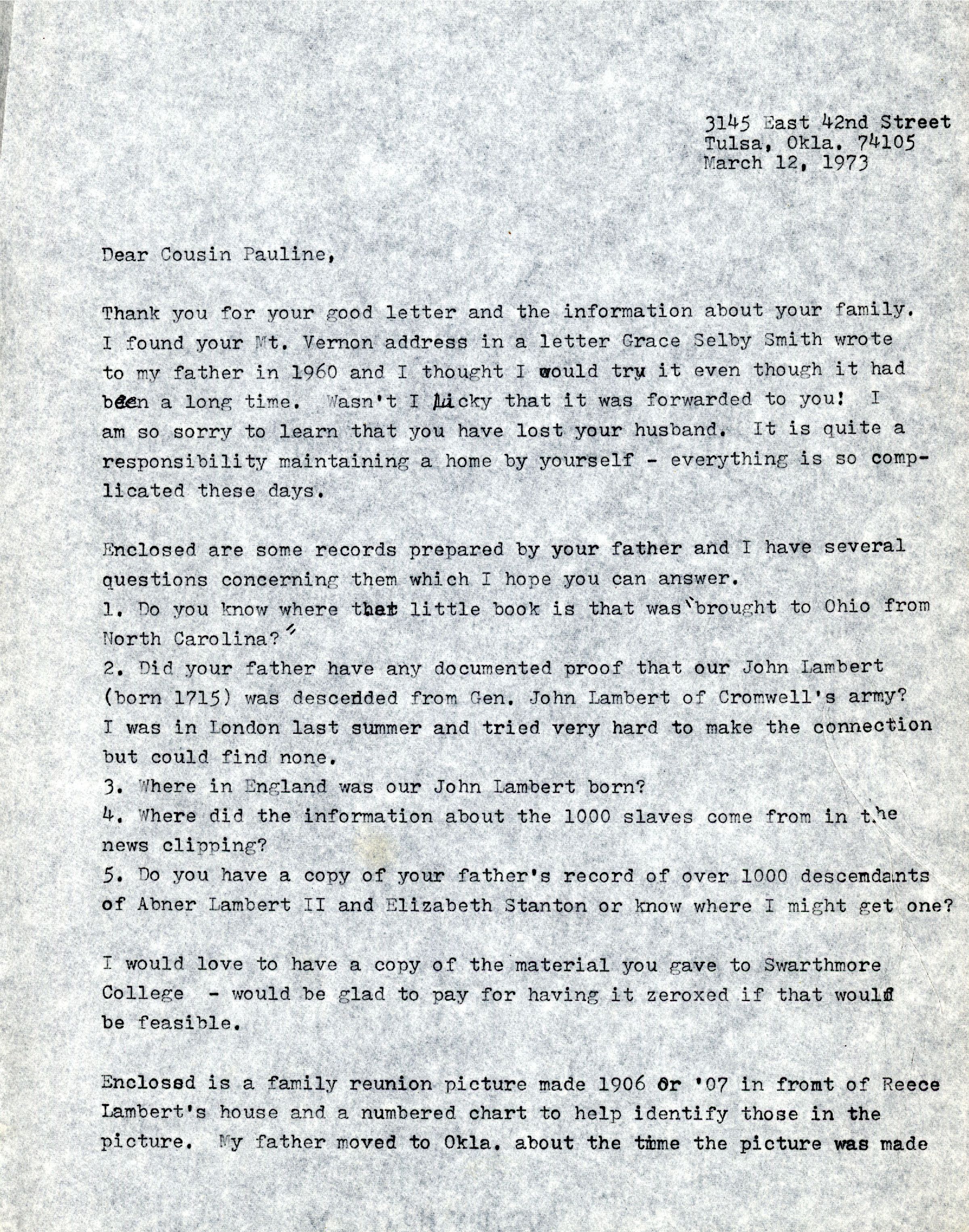 Thank you for your good letter and the information about your family. I found your Mt. Vernon address in a letter Grace Selby Smith wrote to my father in 1960 and I thought I would try it even though it had been a long time. Wasn't I lucky that it was forwarded to you! I am so sorry to learn that you have lost your husband. It is quite a responsibility maintaining a home by yourself - everything is so complicated these days.