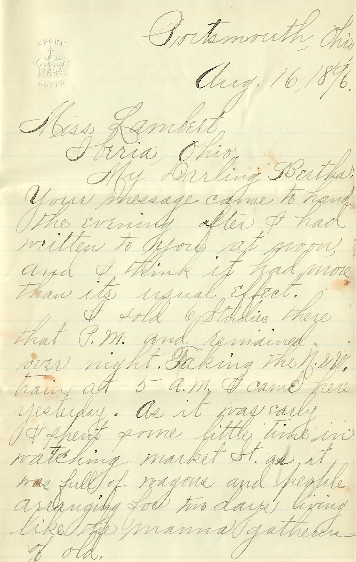 [Portsmouth, OH, to Miss Bertha E. Lambert, Iberia, Ohio, “Morrow Co.”]