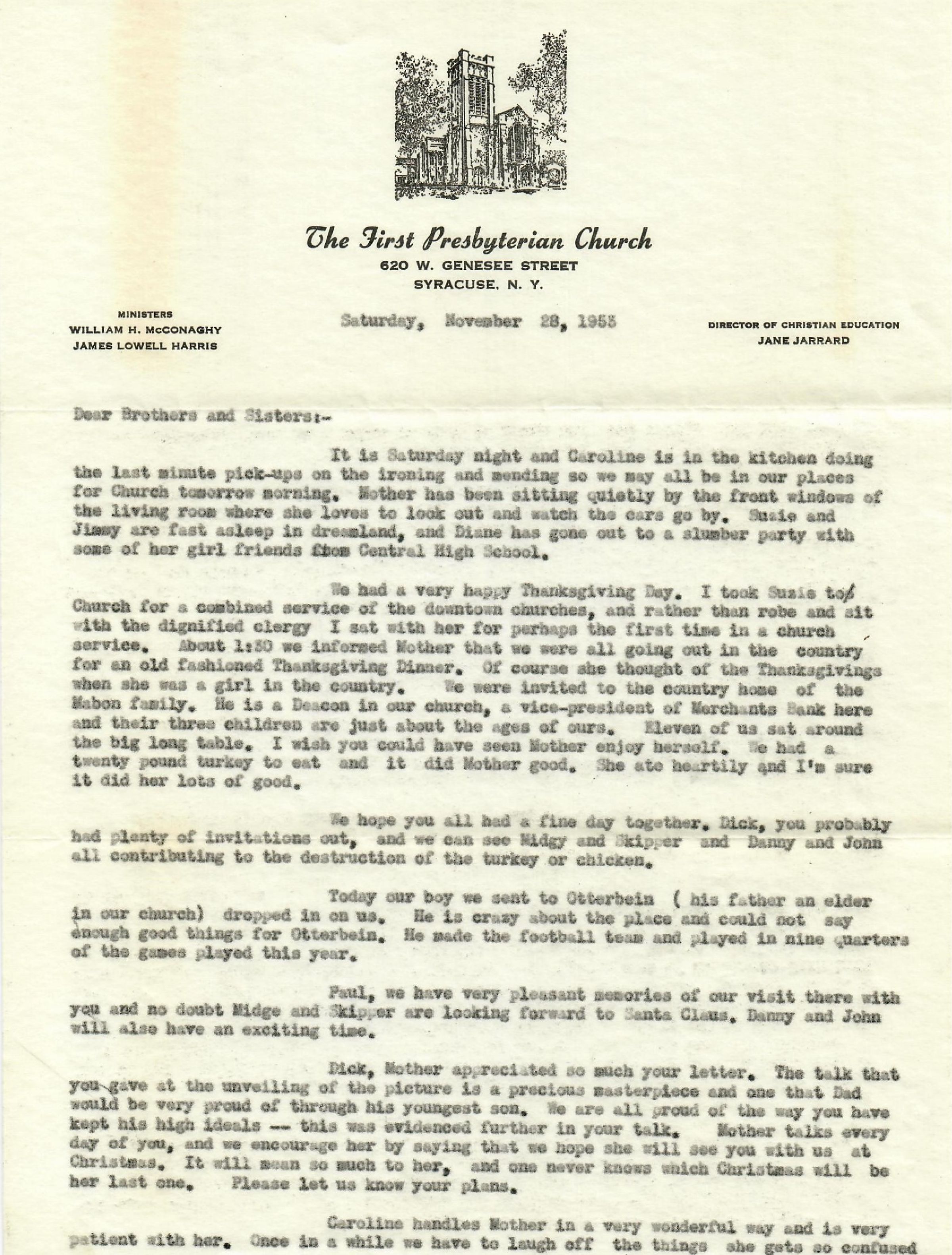 Diane bus been elected as delegate to the National Assembly of Presbyterian youth at the University of Illinois the latter part of June. It will be quite an experience for her, and then she will join us in New Hampshire the second week in July. Jimmy is certainly active little fellow. Think I'll get him a pair of boxing gloves and a punching bag as he tires his daddy out sometimes trying to box and wrestle with me. Suzie loves her work as a chorister in our 50 voice youth choir. She is starting piano lessons, and I think she is full of rhythm and music. She loves to read to Jimmy and they are almost inseparable. Caroline baked three pumpkin pies this morning and our family has eaten practically all of them today. She keeps quite busy on the Women's Association work, keeping Jimmy busy and singing in the choir. Our Adult choir will be on T.V. here in a couple weeks.