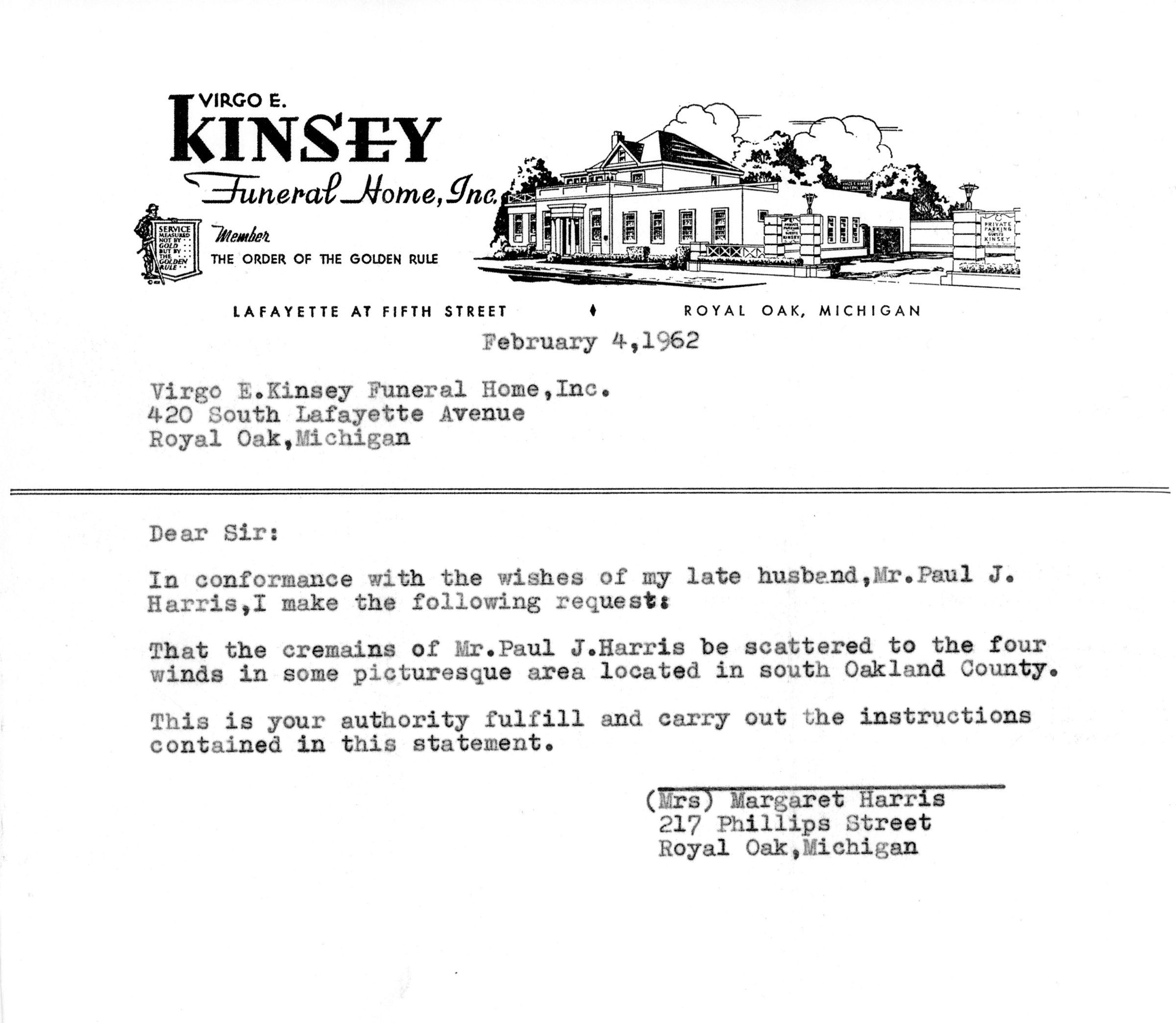 That the cremains of Mr. Paul J. Harris be scattered to the four winds in some picturesque area located in south Oakland County.