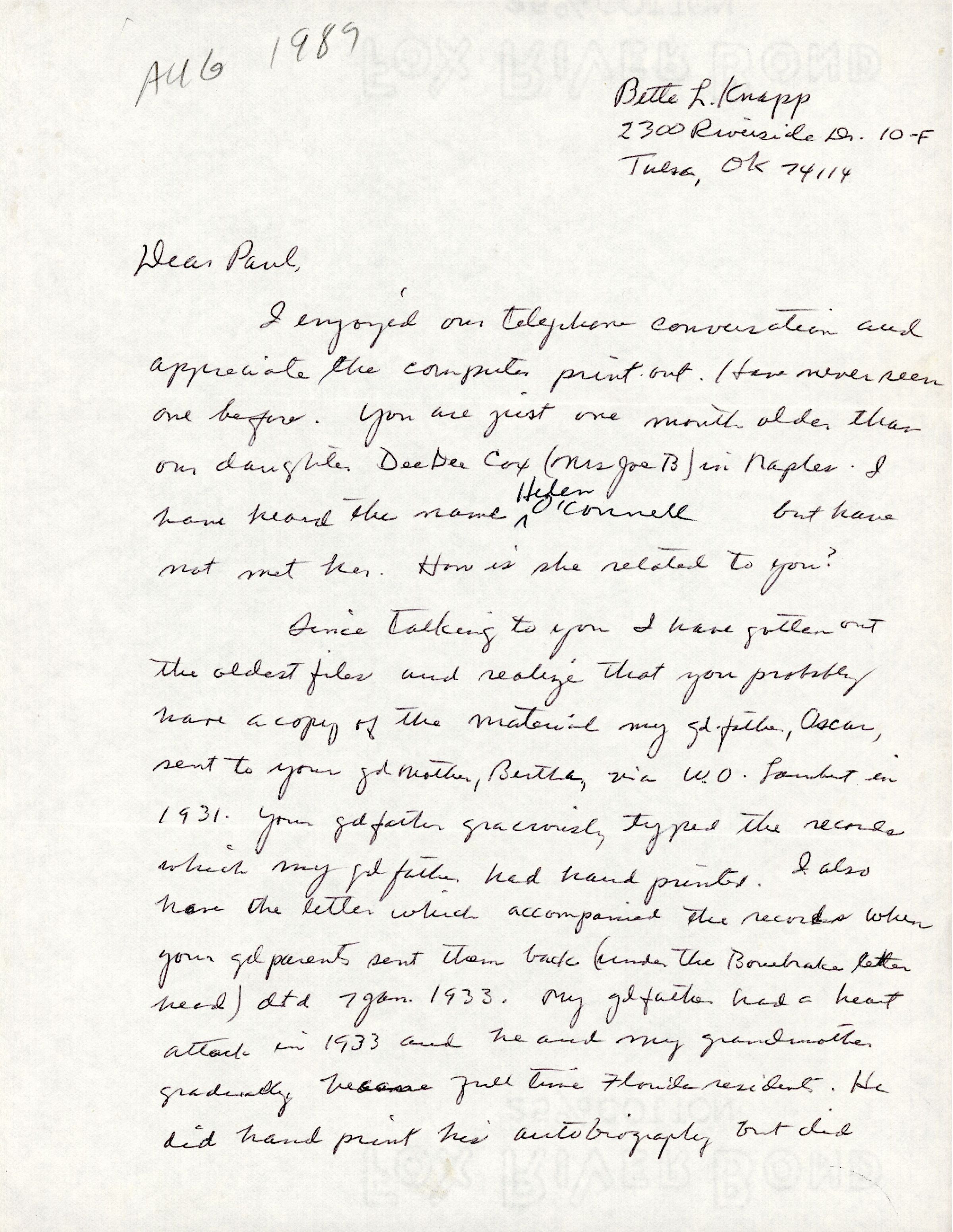 AU Lambert, Mary Elizabeth 'Bette' [Knapp] - 1989-08-01 letter to Paul J. Harris Jr.Entry/Object ID
