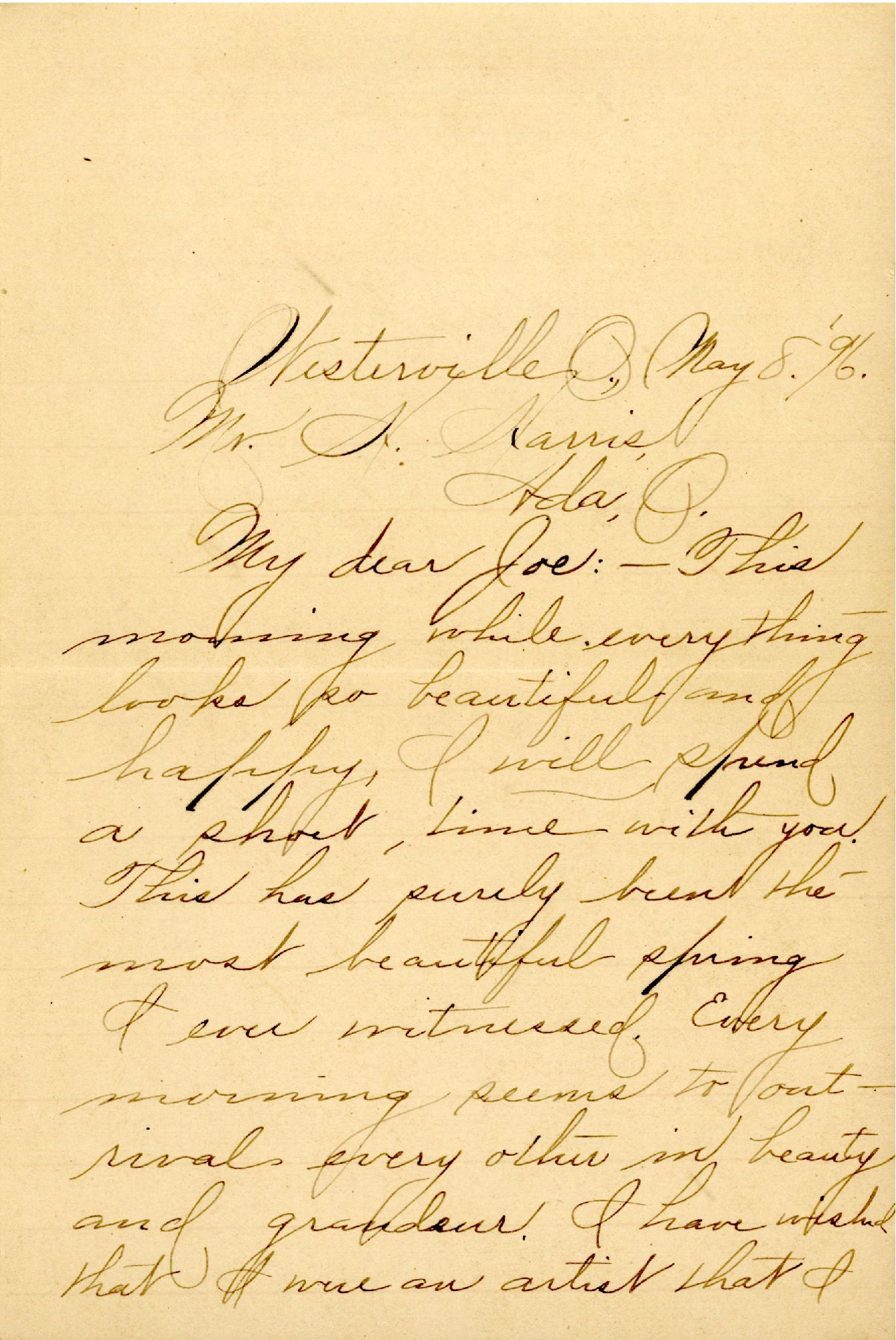 My dear Joe: — This morning while everything looks so beautiful and happy, I will spend a short time with you. This has surely been the most beautiful spring I ever witnessed. Every morning seems to outrival every other in beauty and grandeur. I have wished that I were an artist that I might preserve some of these beautiful sights.