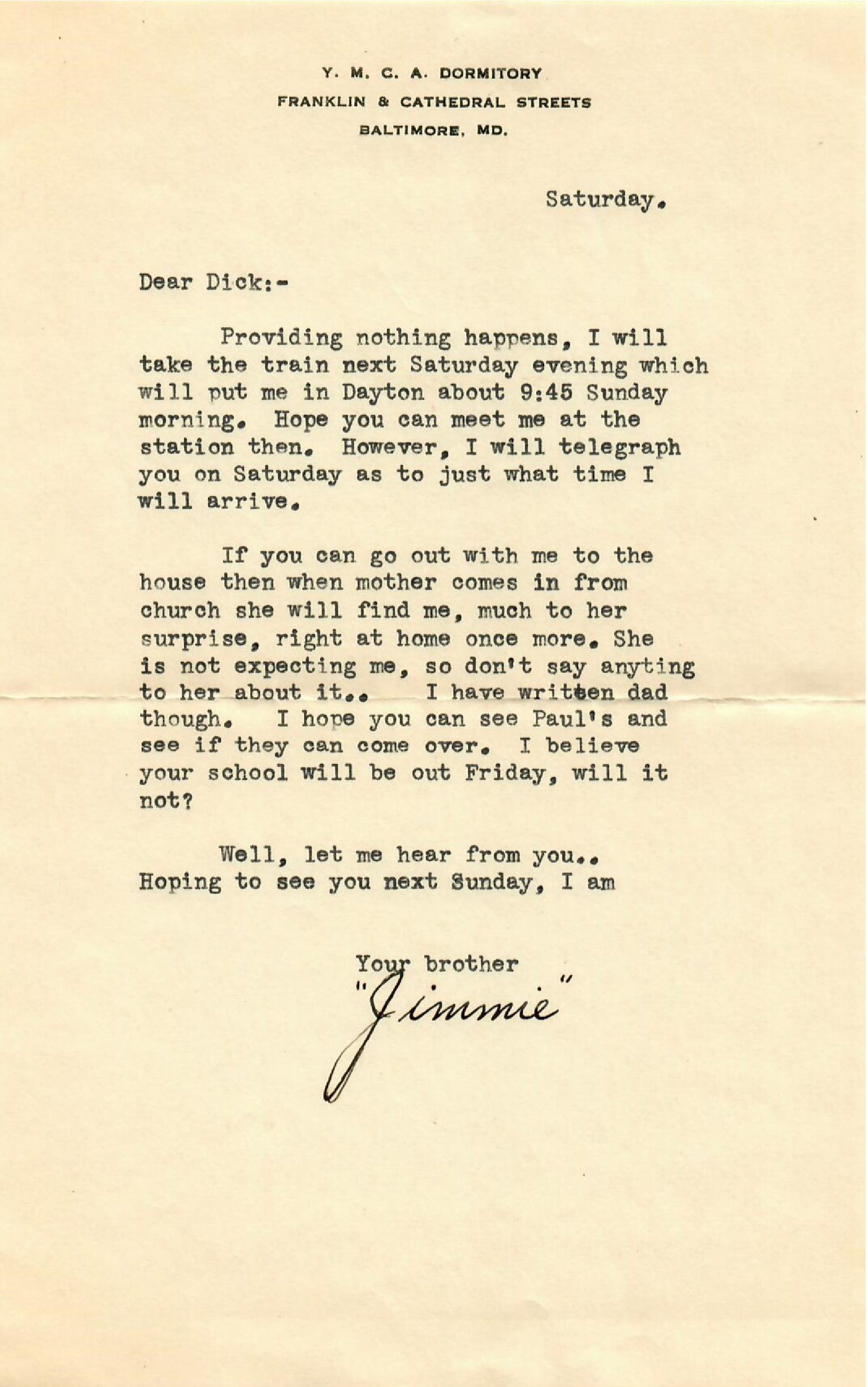 Providing nothing happens, I will take the train next Saturday evening which will put me in Dayton about 9:45 Sunday morning. Hope you can meet me at the station then. However, I will telegraph you on Saturday as to just what time I will arrive.