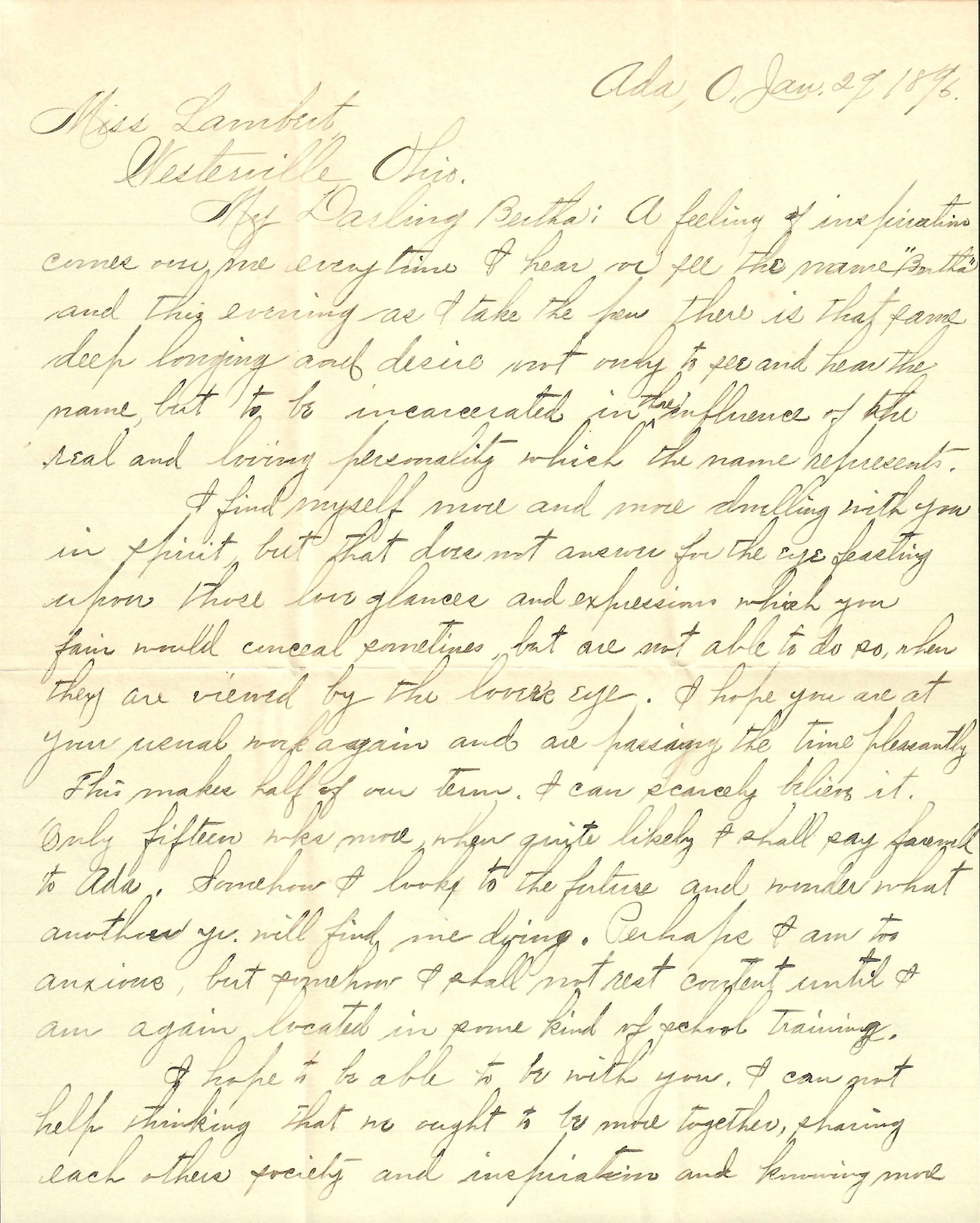 [Ada, OH, to Miss E. Bertha Lambert, Westerville, Ohio, “Franklin Co.”]