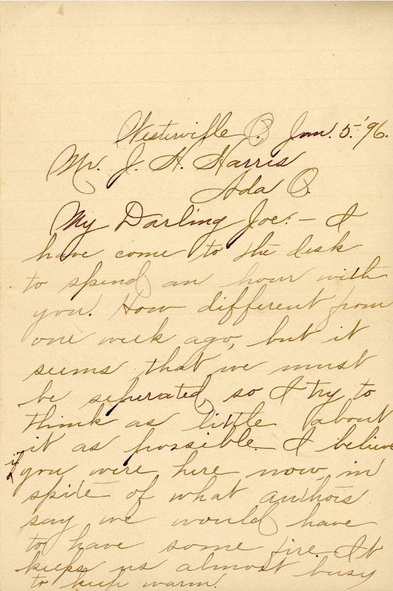 My Darling Joe: — I have come to the desk to spend an hour with you. How different from one week ago, but it seems that we must be separated, so I try to think as little about it as possible. I believe if you were here now, in spite of what authors say we would have to have some fire. It keeps us almost busy to keep warm.