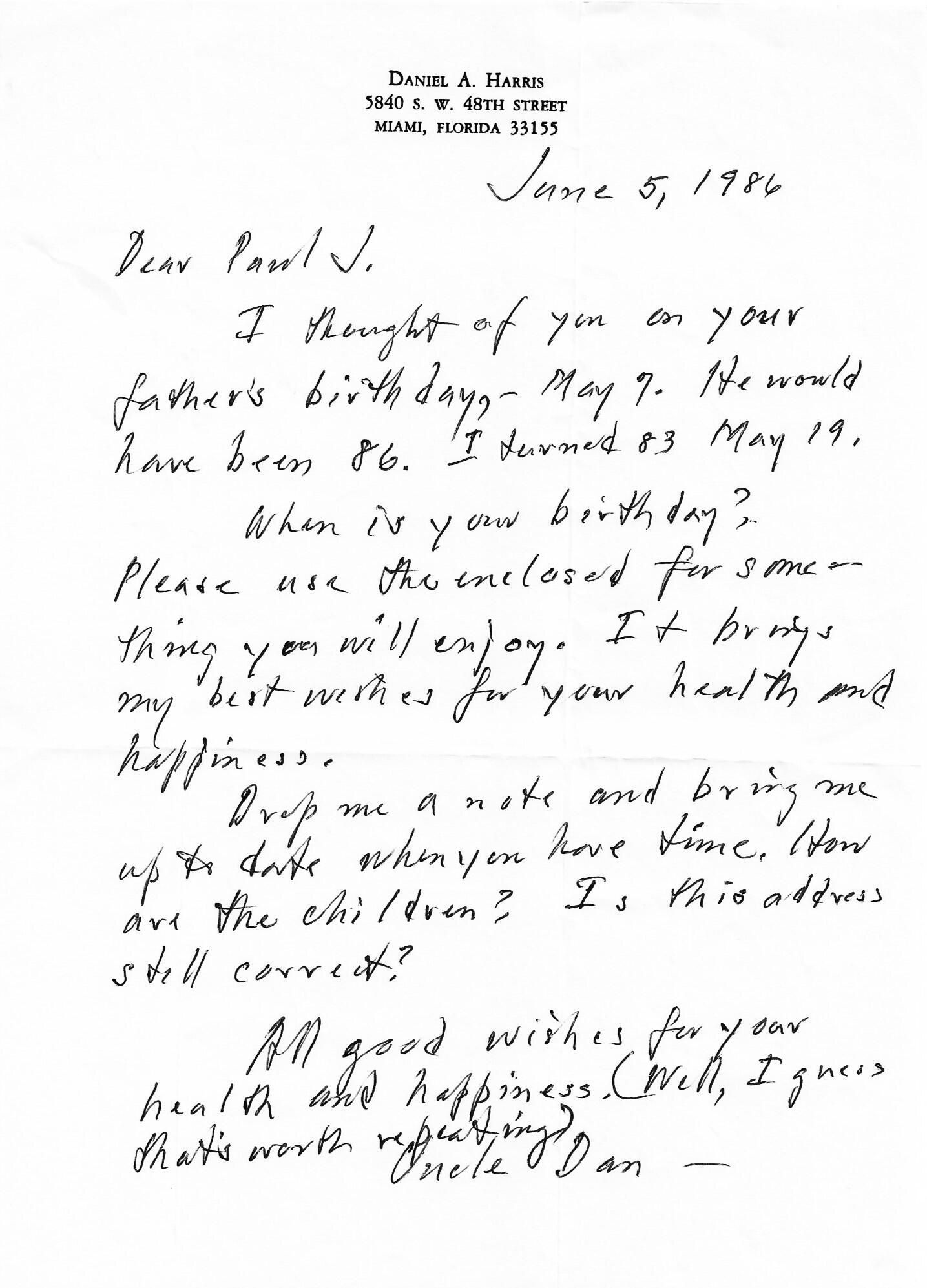 AU Harris, Daniel Alfred - 1986-06-05 letter to Paul J. Harris Jr.Entry/Object ID