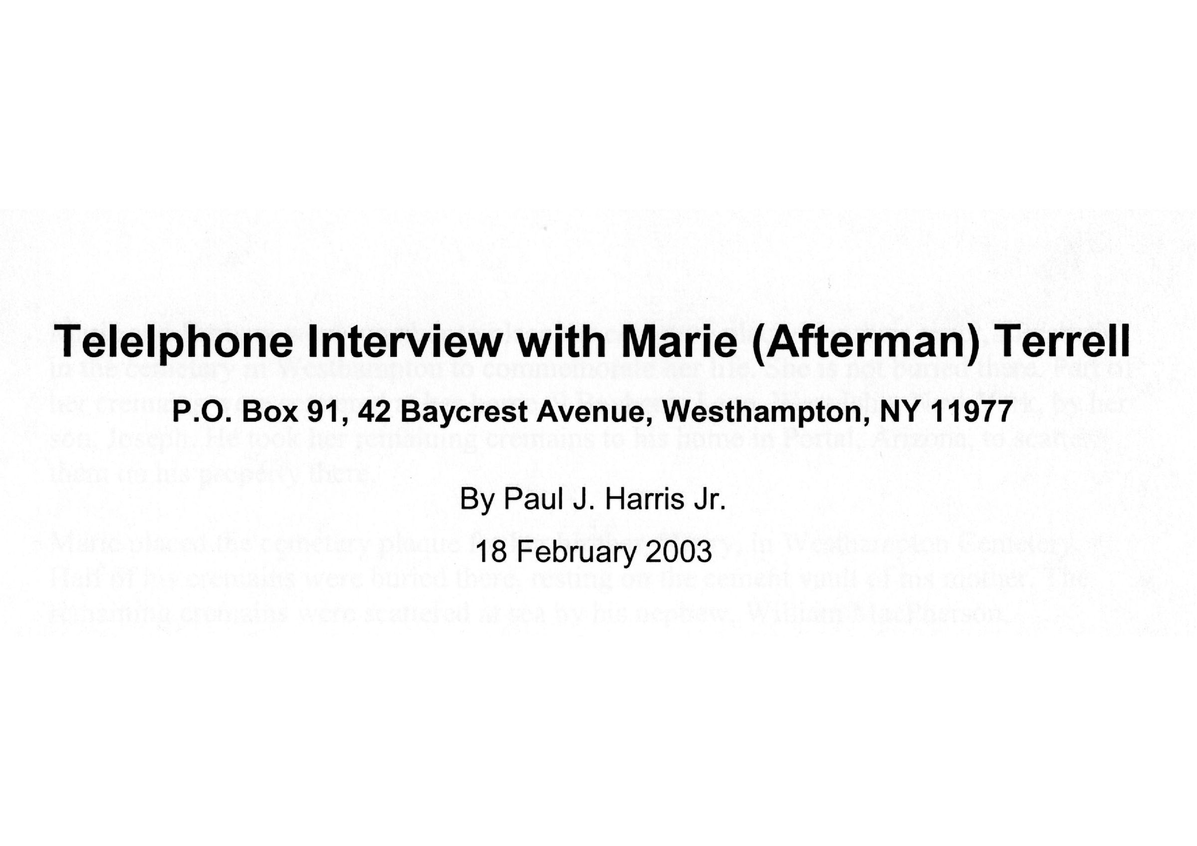 Telelphone Interview with Marie (Afterman) Terrell