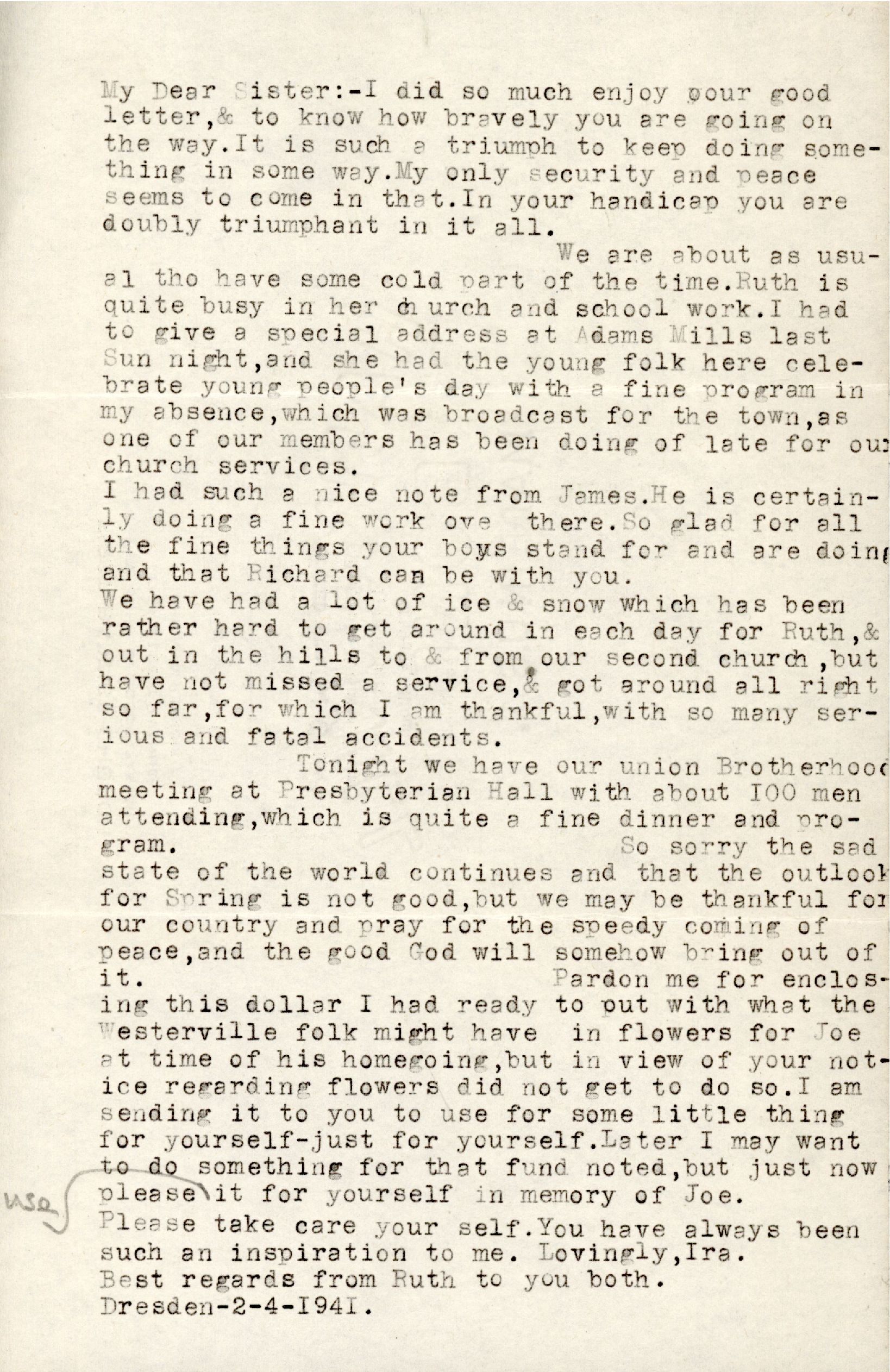 Pardon me for enclosing this dollar I had ready to put with what the Westerville folk might have in flowers for Joe at the time of his homegoing, but in view of your notice regarding flowers did not get to do so. I am sending it to you to use for some little thing for yourself-just for yourself. Later I may want to do something for that fund noted, but just now please use it for yourself in memory of Joe.