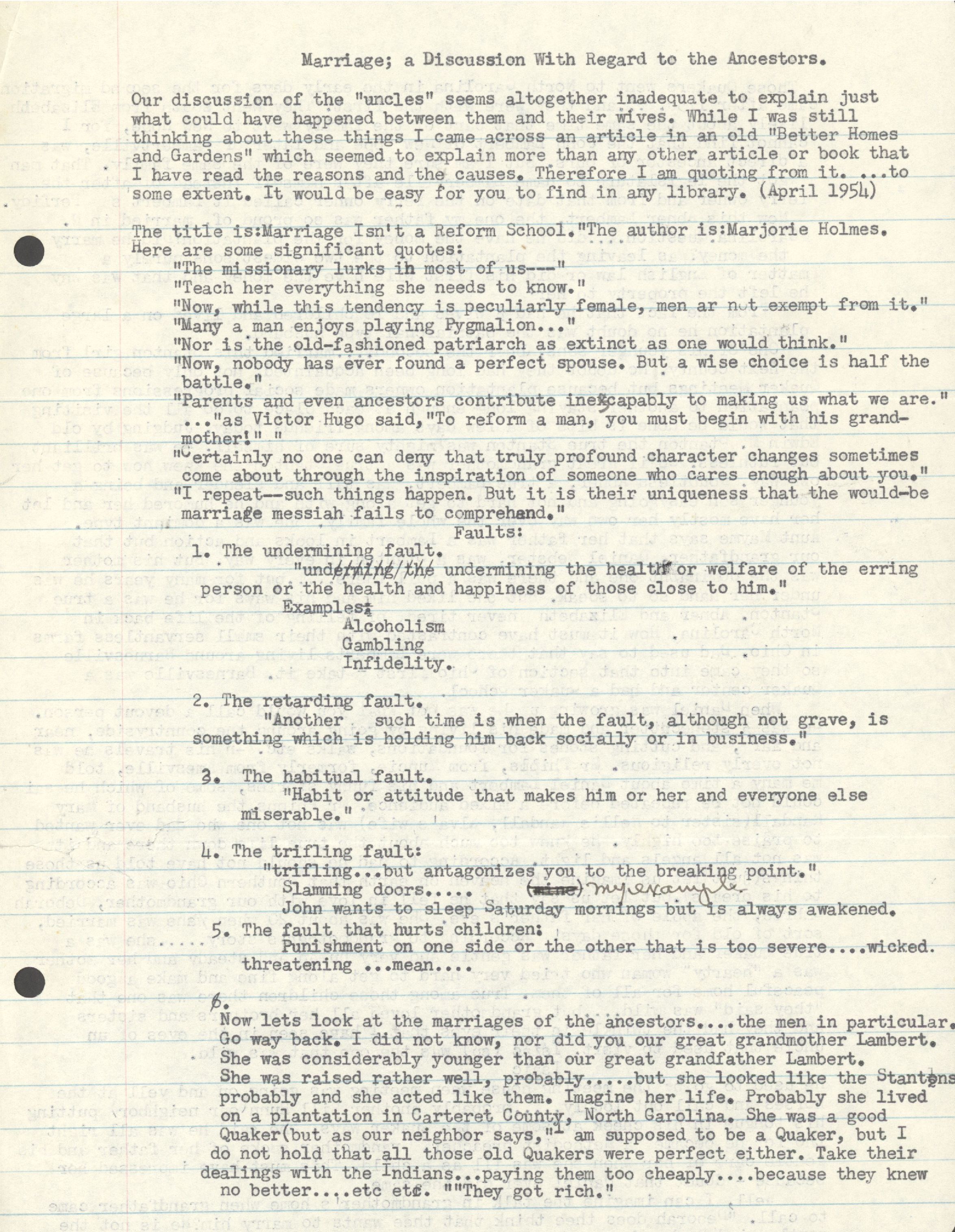 Our discussion of the "uncles" seems altogether inadequate to explain just what could have happened between them and their wives. While I was still thinking about these things I came across an article in an old "Better Homes and Gardens" which seemed to explain more than any other article or book that I have read the reasons and the causes. Therefore I am quoting from it. ...to some extant. It would be easy for you to find in any library. (April 1954)