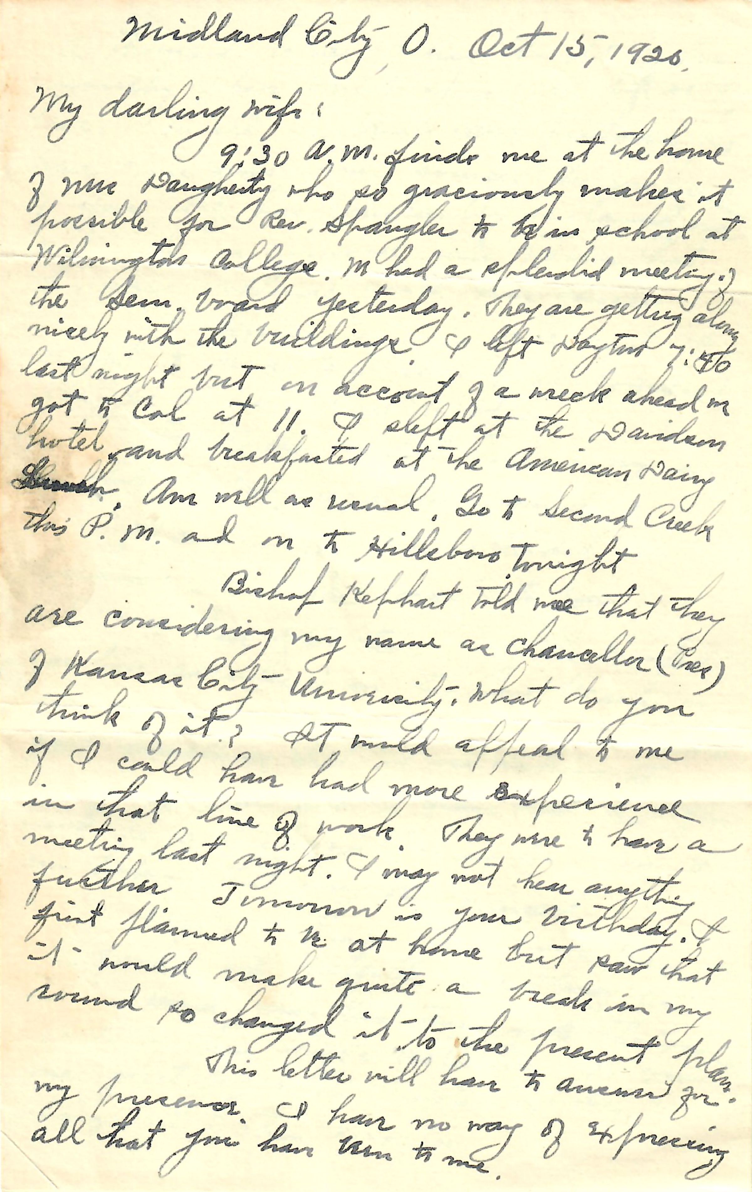 Bishop Kephart told me that they are considering my name as chancellor (Pres) of Kansas City University. What do you think of it? It would appeal to me if I could have had more experience in that line of work. They were to have a meeting last night. I May not hear anything further. Tomorrow is you birthday. I first planned to be at home but saw that it would make quite a break in my round so changed it to the present plan.