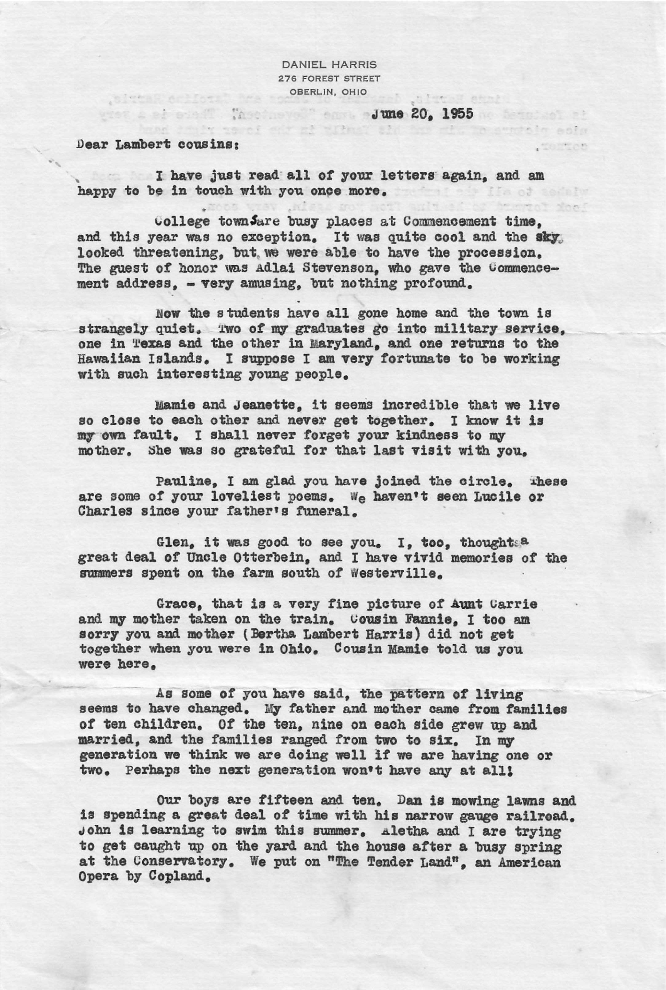 College towns are busy places at Commencement time, and this year was no exception. It was quite cool and the sky looked threatening, but we were able to have the procession. The guest of honor was Adlai Stevenson, who gave the Commencement address, - very amusing, but nothing profound.