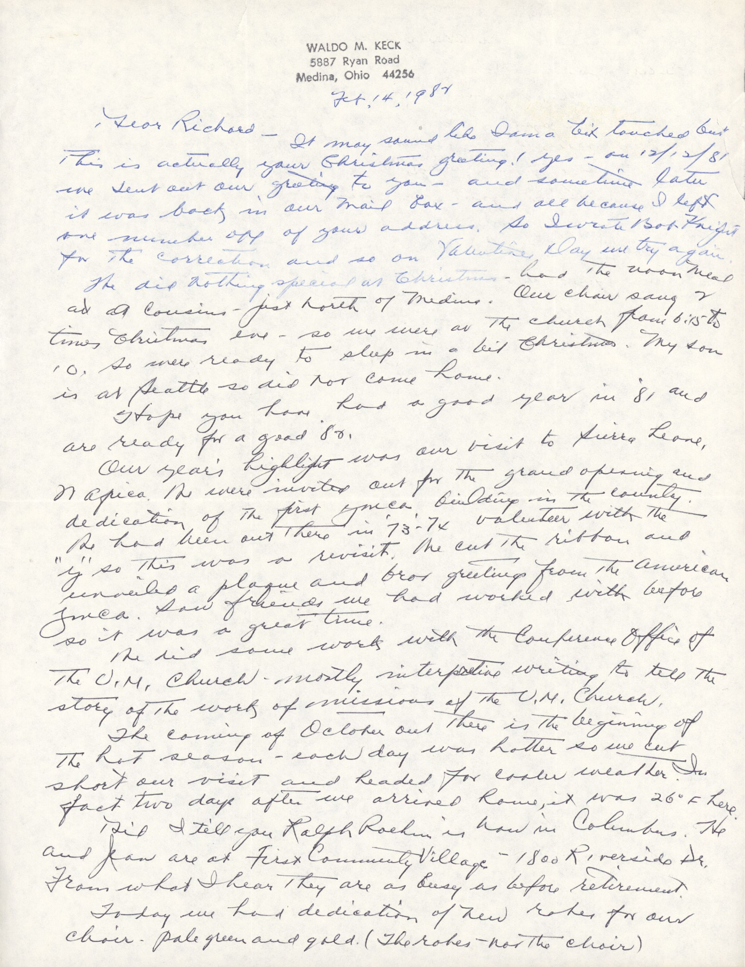 Did I tell you Ralph Roehm is now in Columbus. He and Jean are at First Community Village — 1800 Riverside Dr. From what I hear they are as busy as before retirement.