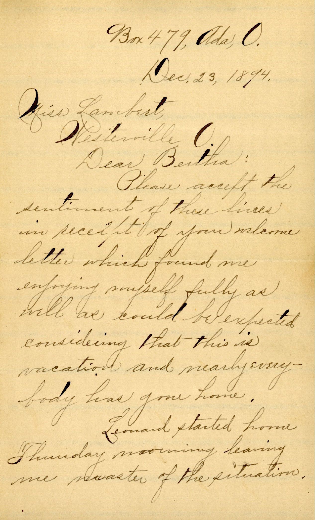 Letter from Joseph Hastings Harris (Ada, Ohio) to Bertha Elizabeth Lambert (Westerville, Ohio), 23 December 1894Context