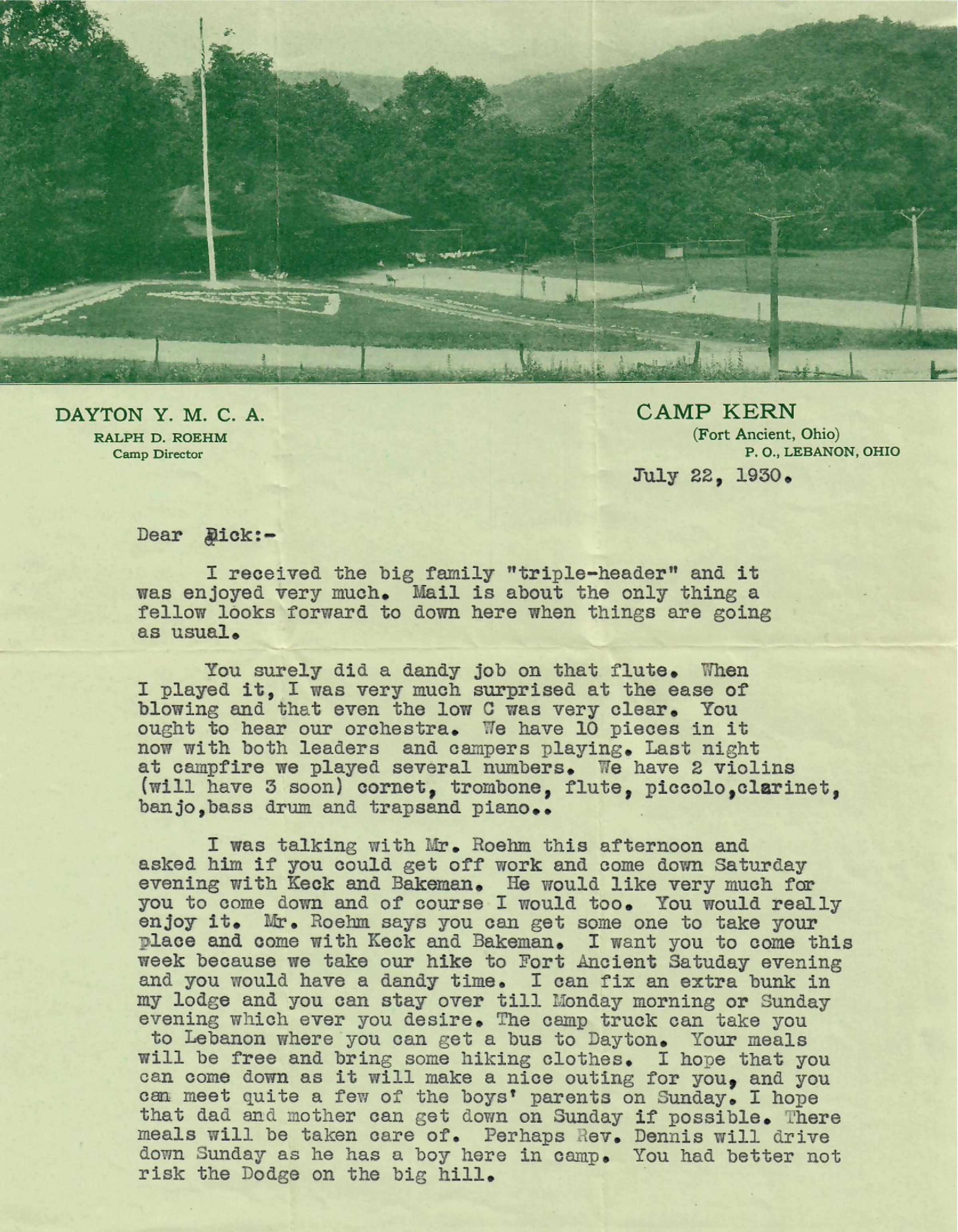 I was talking with Mr. Roehm this afternoon and asked him if you could get off work and come down Saturday evening with Keck and Bakeman. He would like very much for you to come down and of course I would too. You would really enjoy it. Mr. Roehm says you can get some one to take your place and come with Keck and Bakeman. I want you to come this week bercause we take our hike to Fort Ancient Satuday [sic] evening and you would have a dandy time. I can fix an extra bunk in my lodge and you can stay over till Monday morning or Sunday evening which ever you desire. The camp truck can take you to Lebanon where you can get a bus to Dayton. Your meals will be free and bring some hiking clothes. I hope that you can come down as it will make a nice outing for you, and you can meet quite a few of the boys' parents parents on Sunday. I hope that dad and mother can get down on Sunday if possible. There [sic] meals will be taken care of. Perhaps Rev. Dennis will drive down Sunday as he has a boy here in the camp. You had better not risk the Dodge on the big hill.